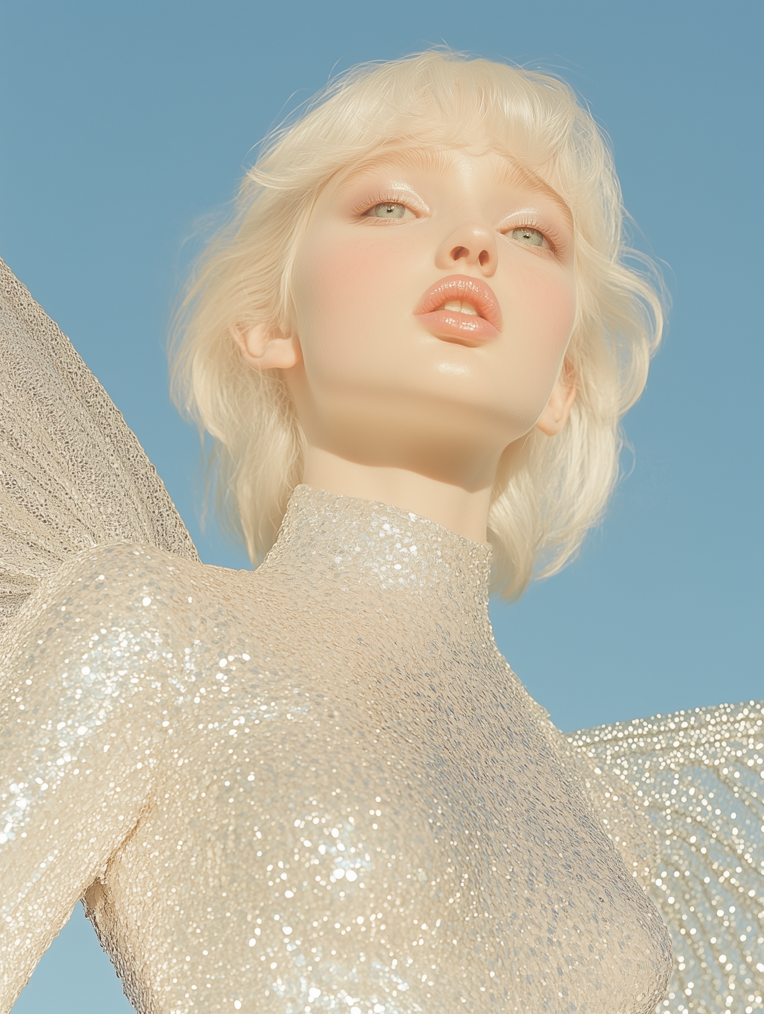 Ethereal portrait of a woman in a shimmering outfit against a clear blue sky, exuding a serene and angelic aura.