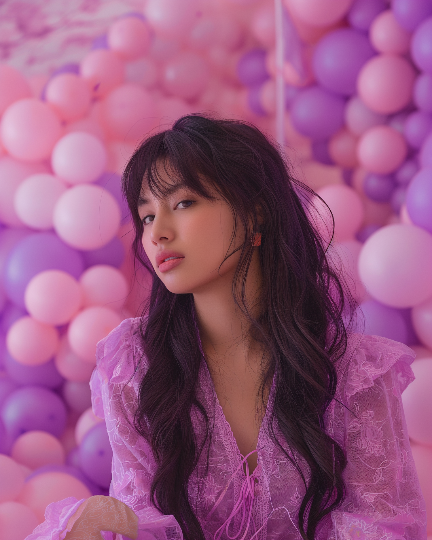 Asian woman in a purple lace blouse poses against a backdrop of pink and purple balloons, creating a dreamy, elegant atmosphere.