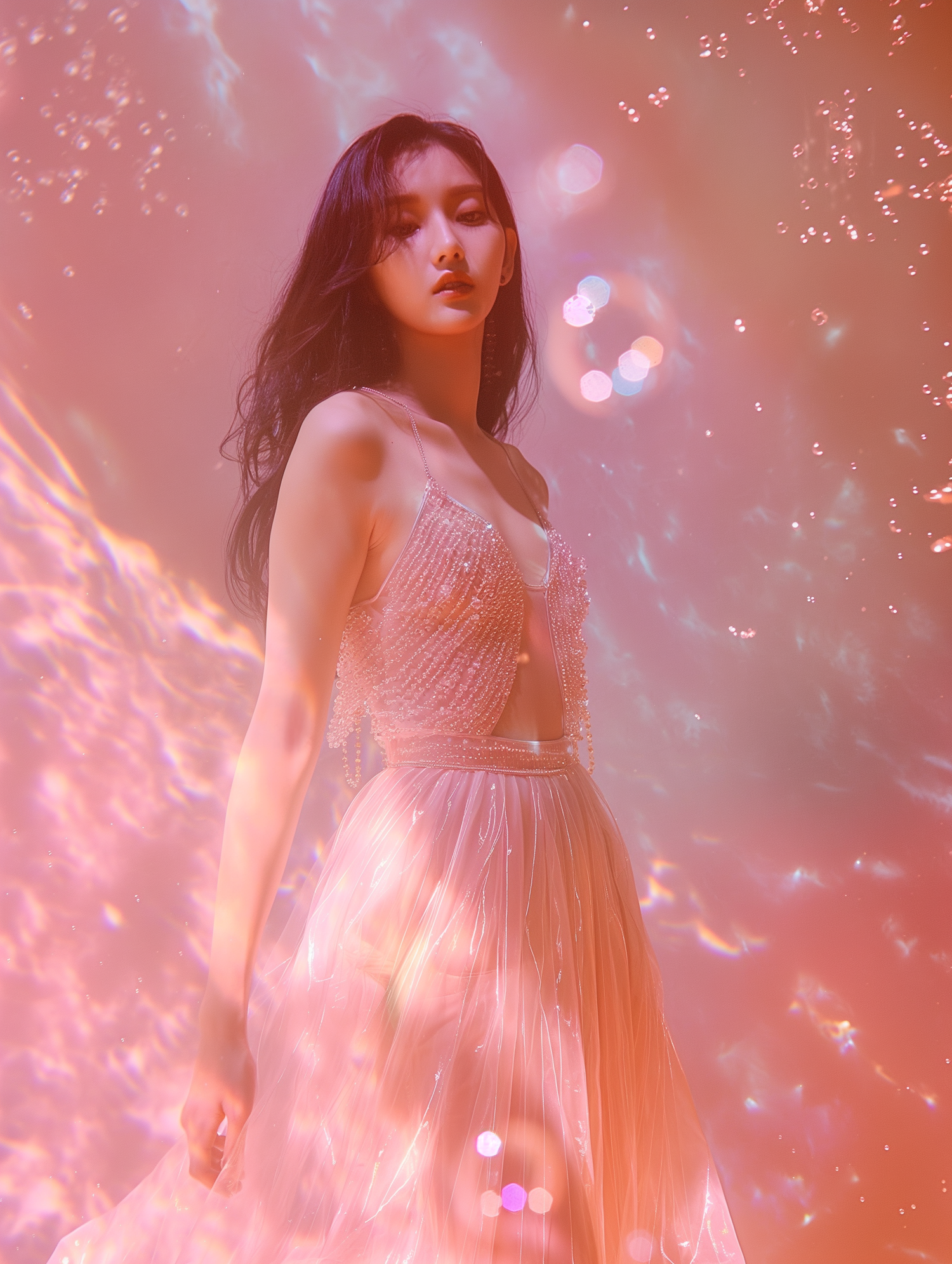 Elegant woman in a pearl-embellished gown amidst a dreamy pink and orange backdrop with bokeh effects.