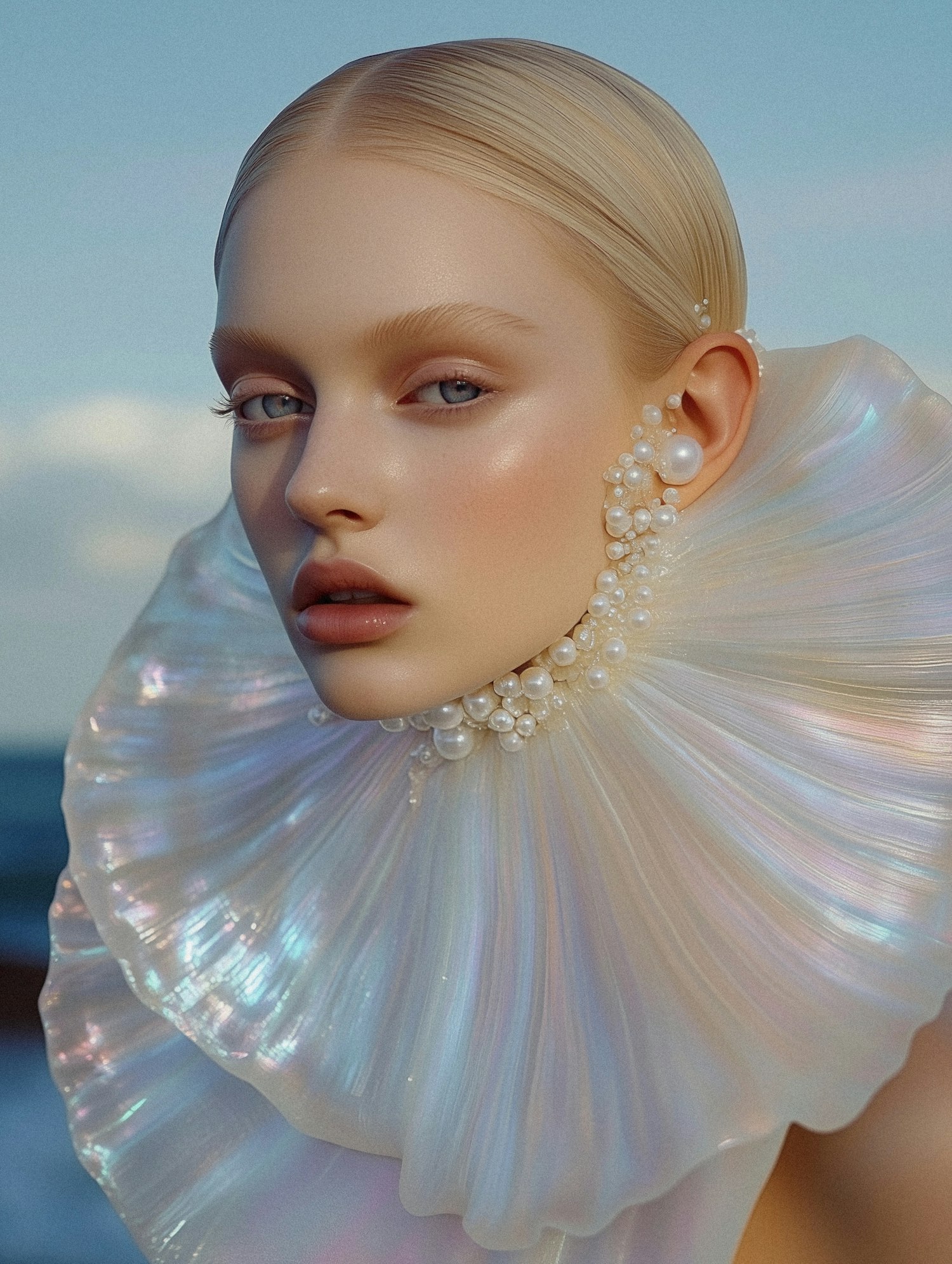 Elegant portrait of a woman with iridescent seashell collar and pearl adornments, set against a serene blue background.