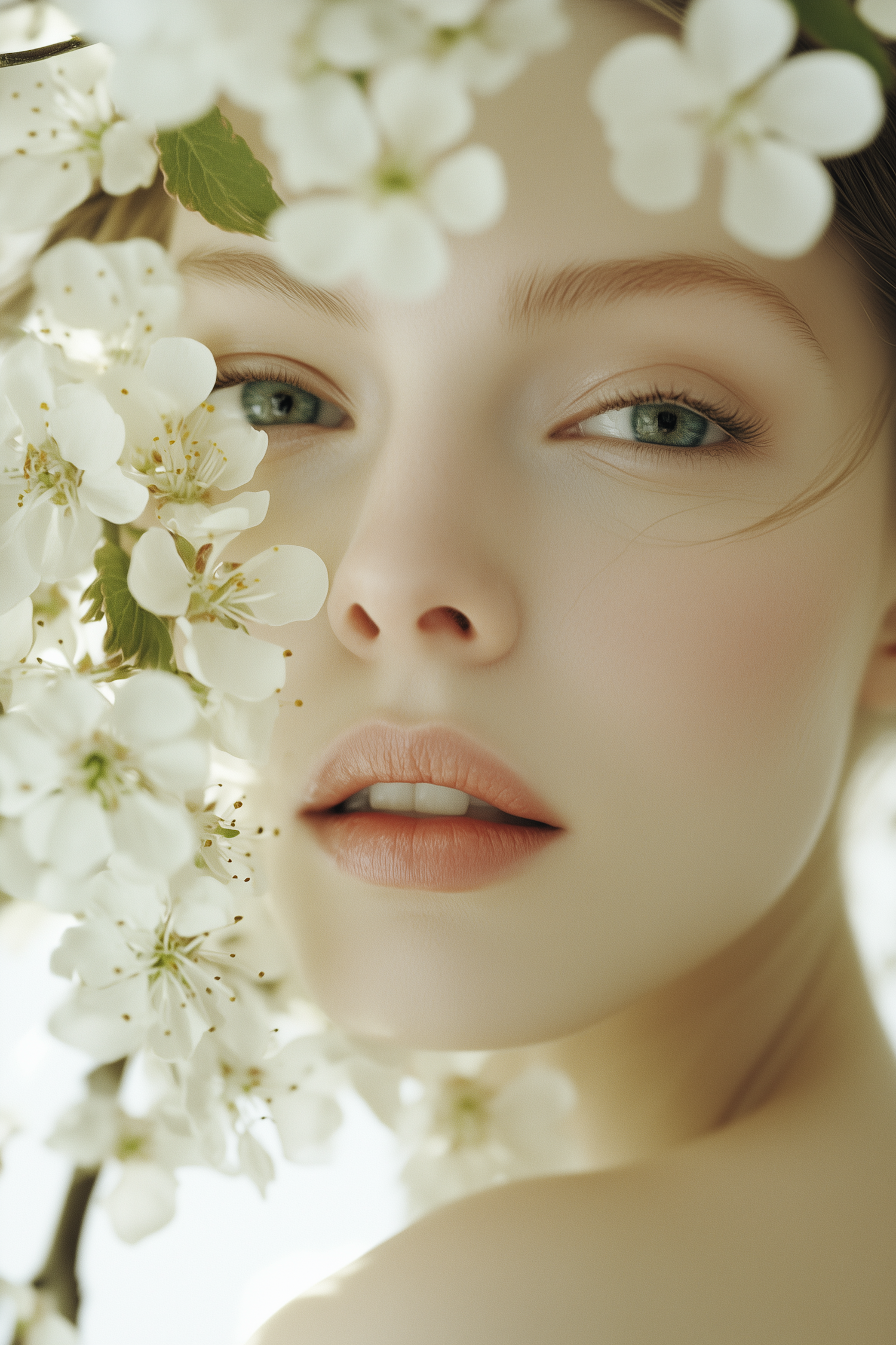 Close-up of a serene woman with light green eyes surrounded by white blossoms, creating a natural and ethereal look.