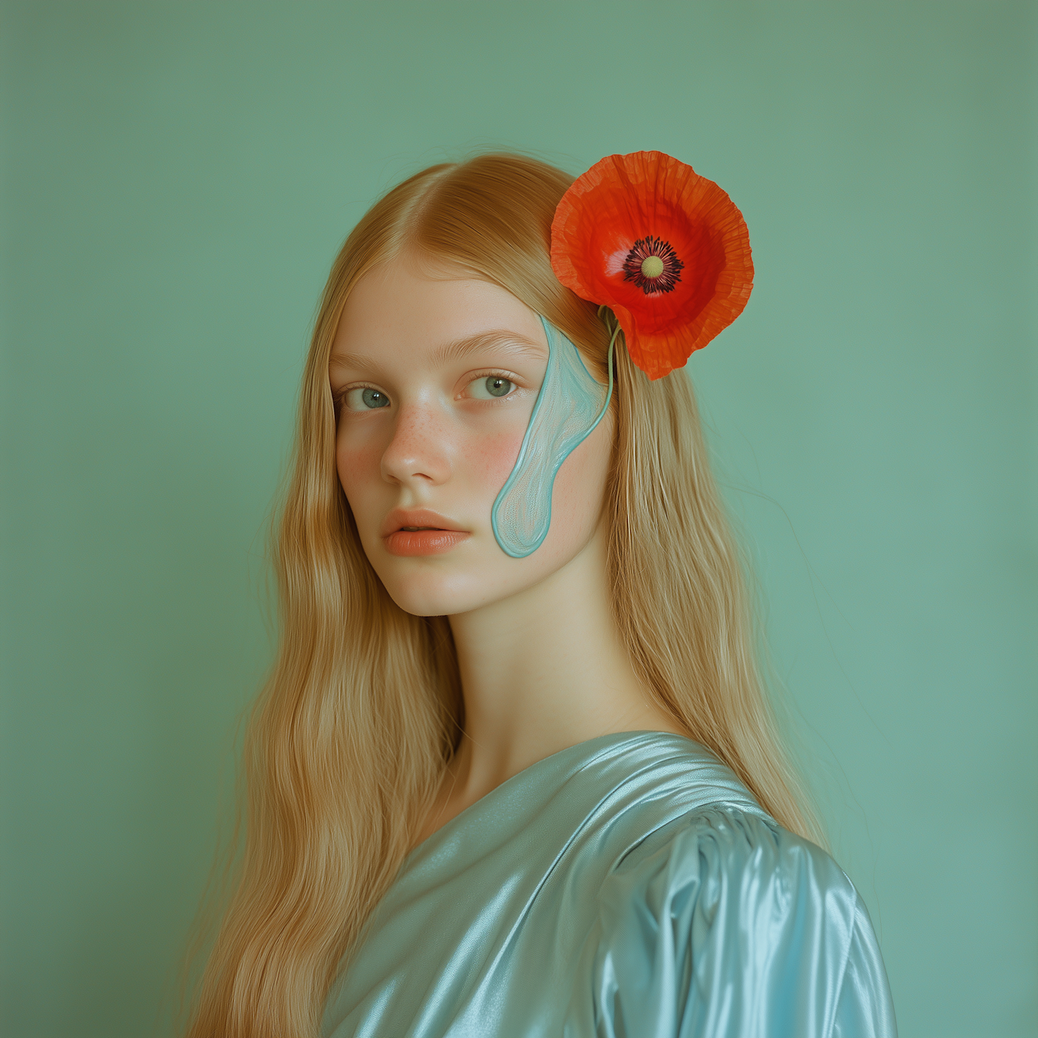 Ethereal portrait of a young woman with a red poppy in her hair and blue paint on her face, set against a pastel green background.