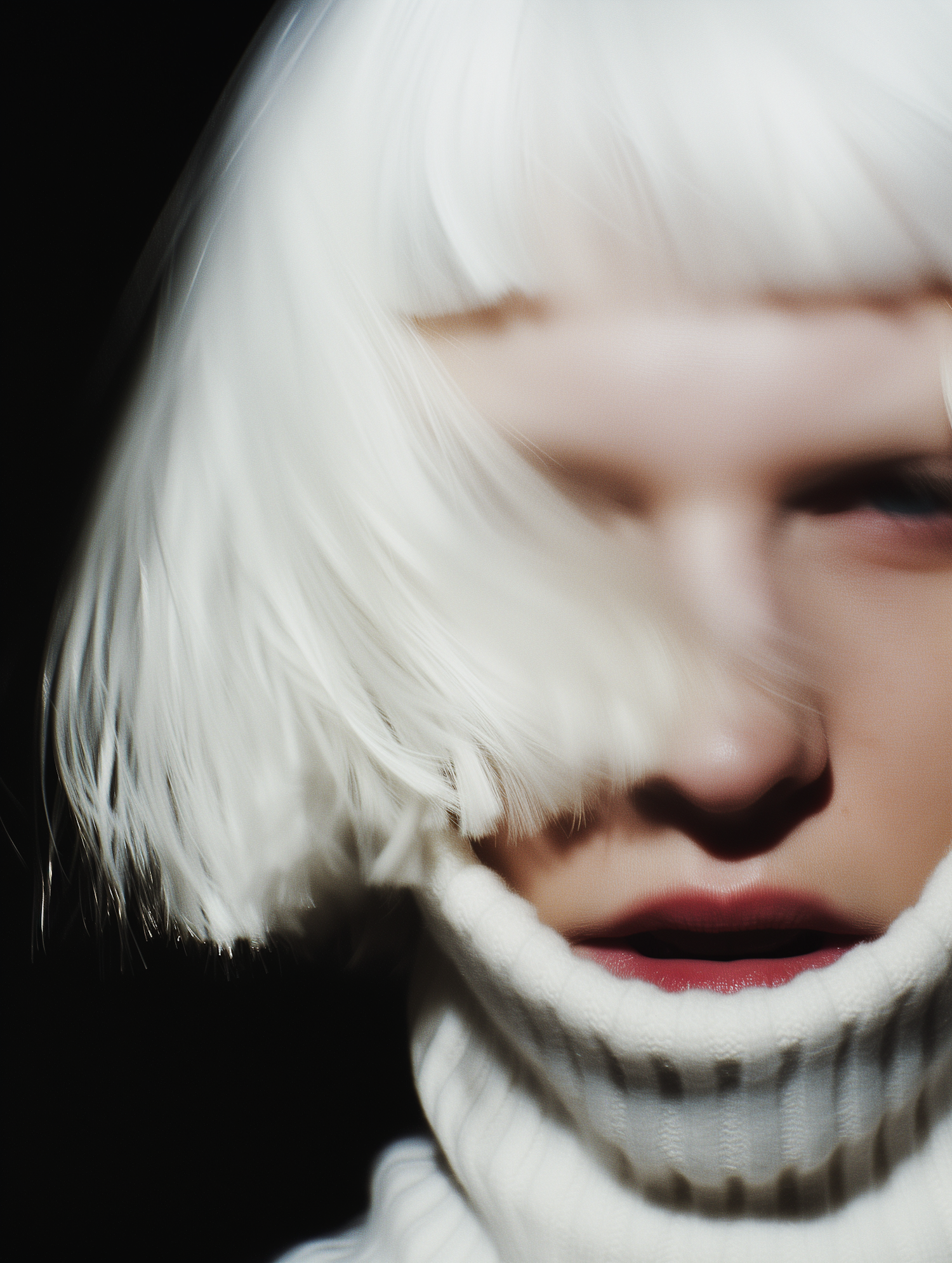 Close-up of a person with platinum blonde hair and a white turtleneck, set against a dark background for a dramatic, mysterious vibe.