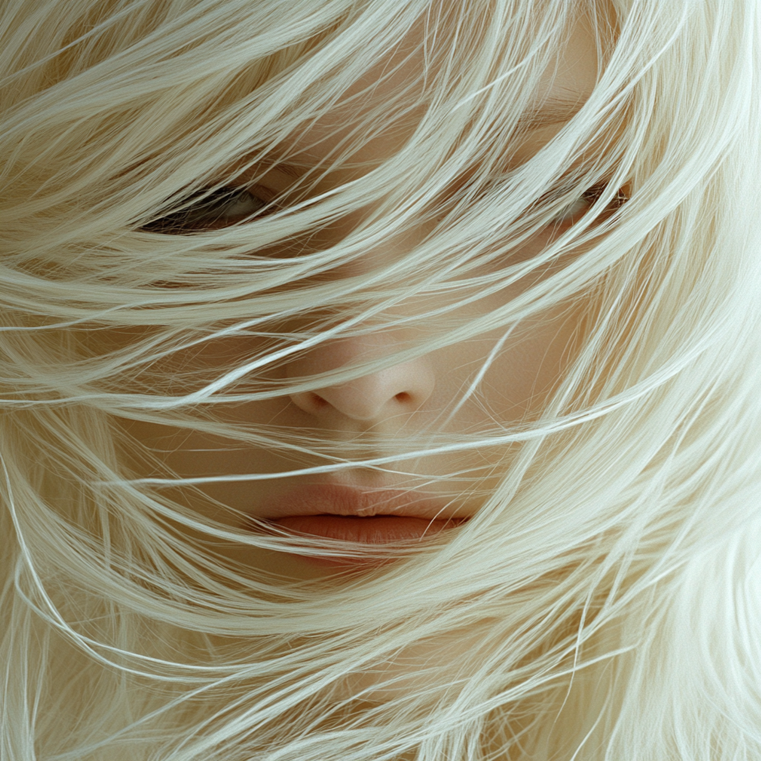 Close-up of a face with windswept platinum blonde hair, soft lighting, and a mysterious, ethereal vibe.