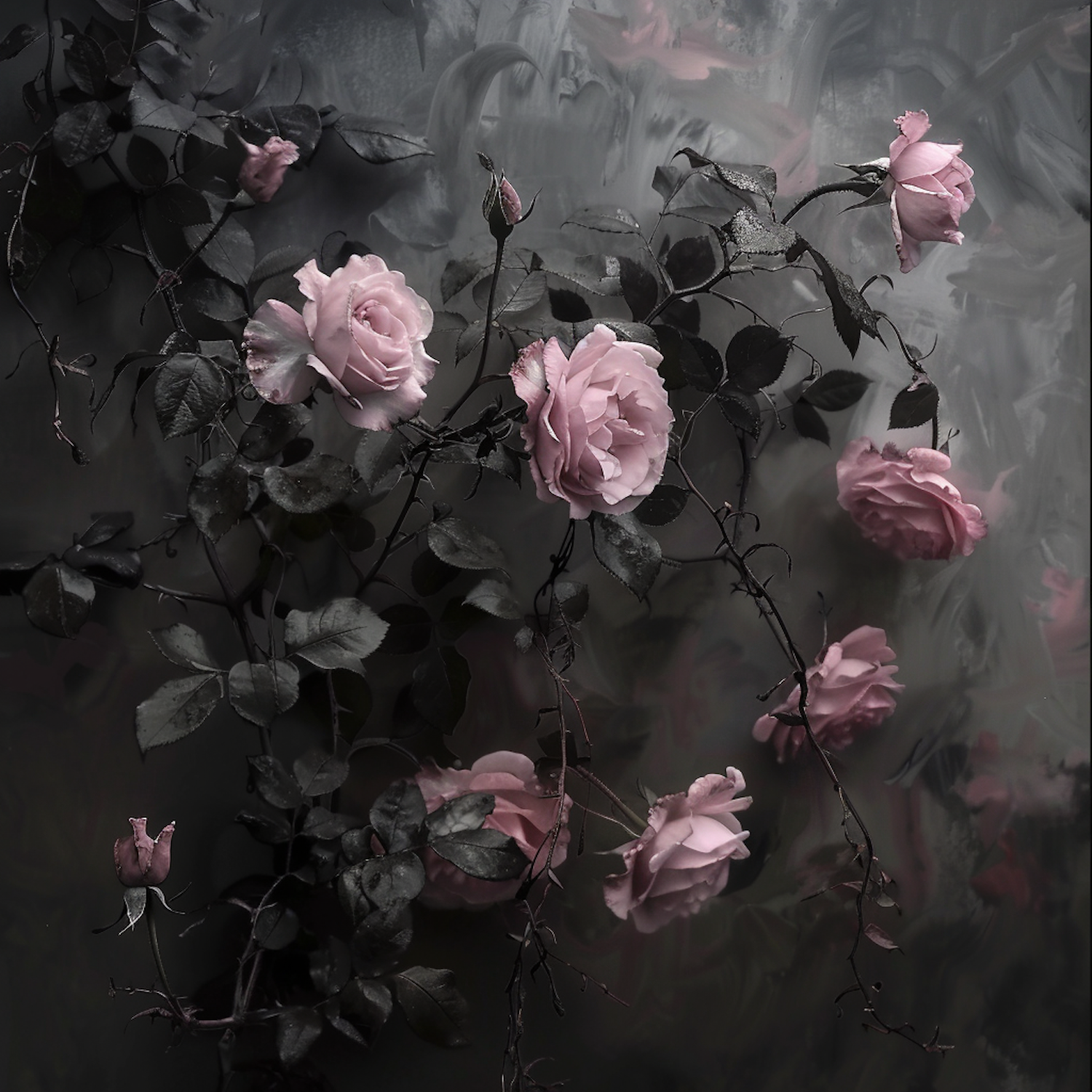 Elegant pink roses in full bloom against a dark, moody background, creating a serene and timeless floral scene.