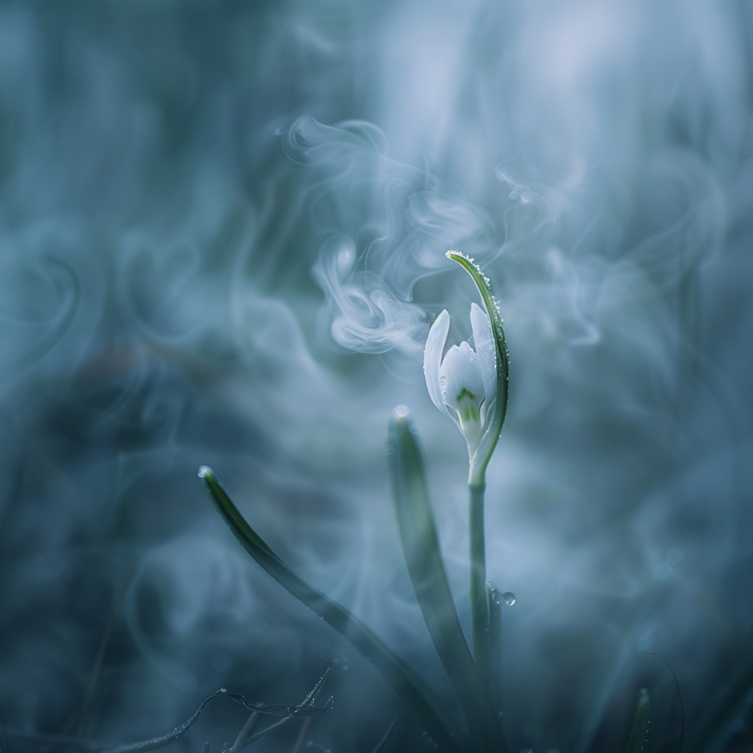 A delicate white flower bud with dew in a misty, ethereal setting, surrounded by green leaves and soft bluish hues.