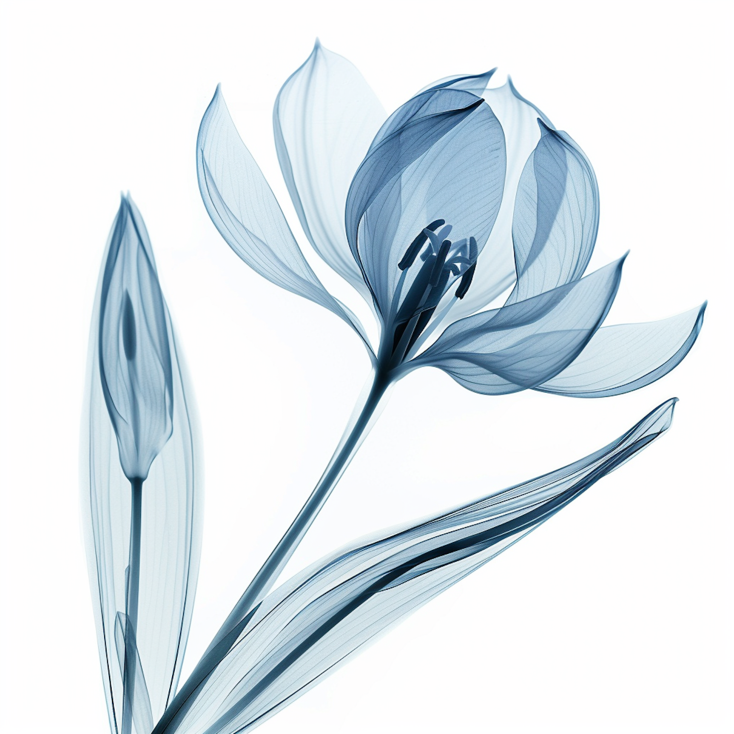 Artistic x-ray image of a flower with translucent petals and soft blue hues, revealing intricate internal structures.