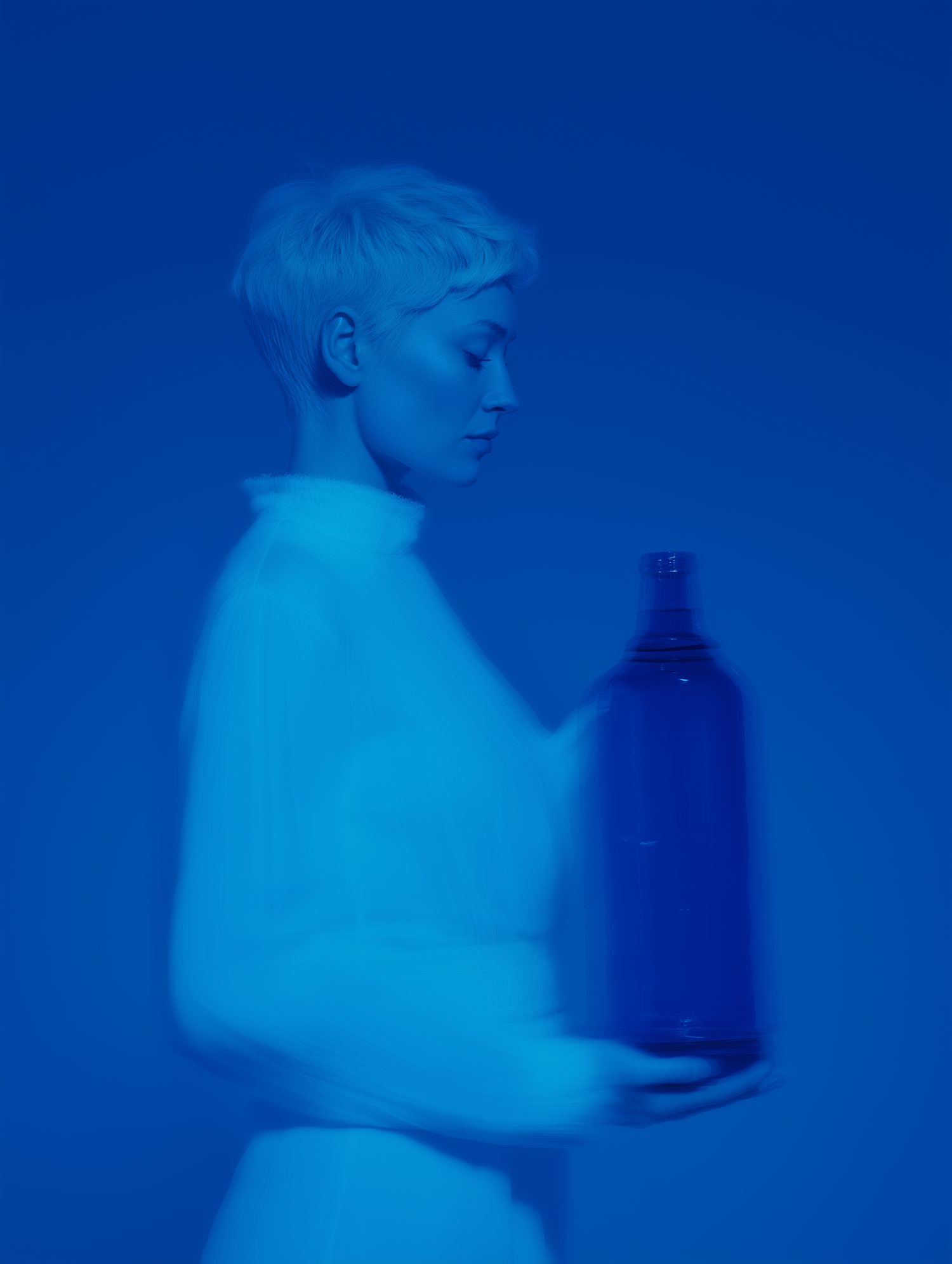 A dreamy, monochromatic blue portrait of a person holding a large bottle, with soft focus and ethereal lighting.