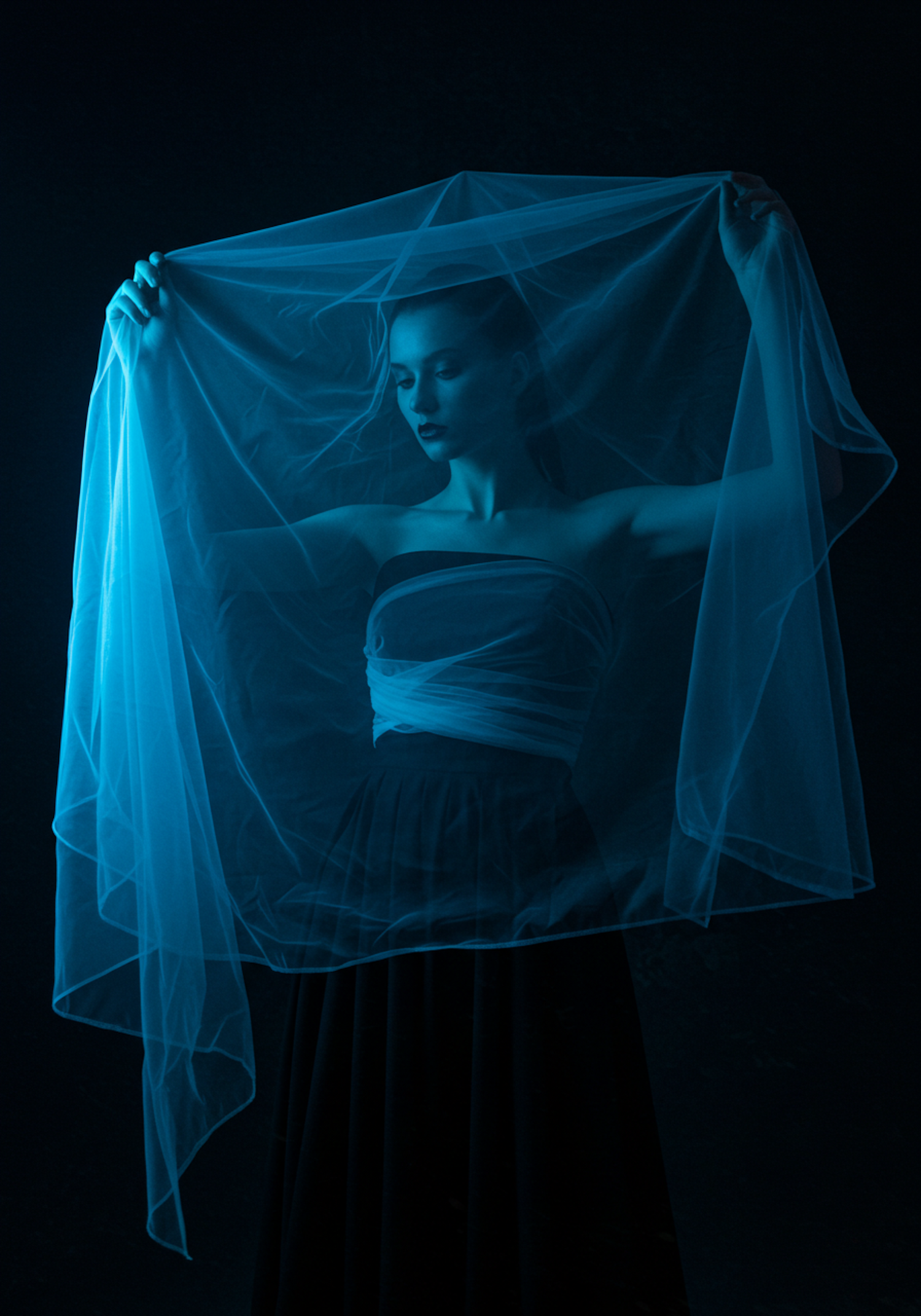 A serene portrait of a woman holding sheer blue fabric under soft lighting, creating an ethereal and elegant atmosphere.