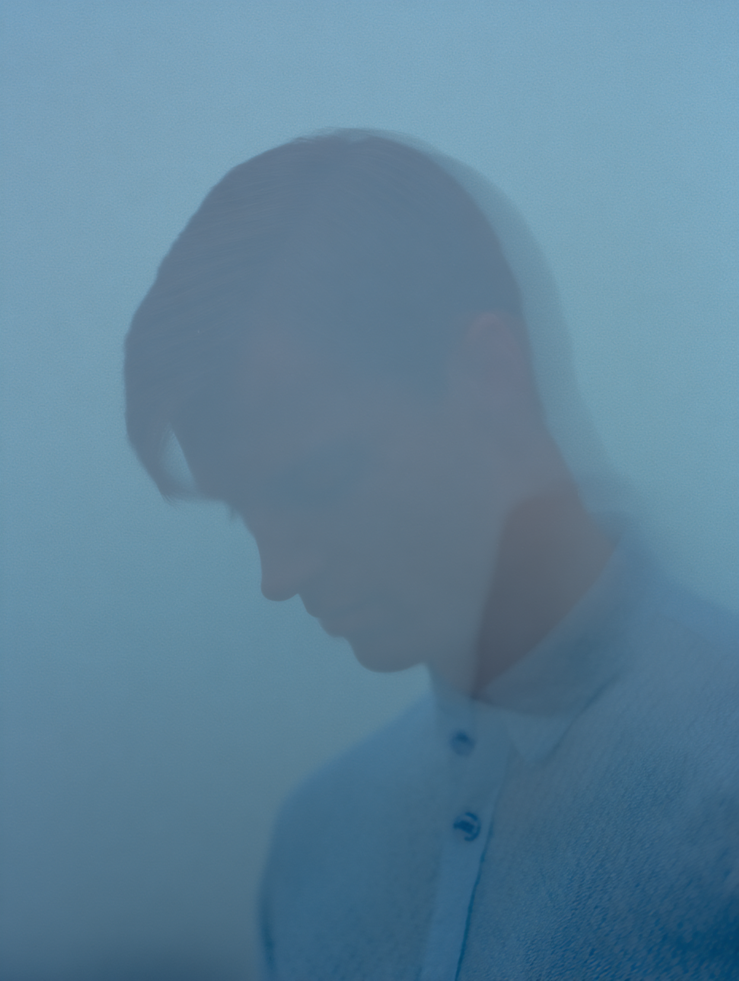 Dreamy, blue-hued portrait of a person in a button-up shirt, with a soft, abstract double exposure effect.