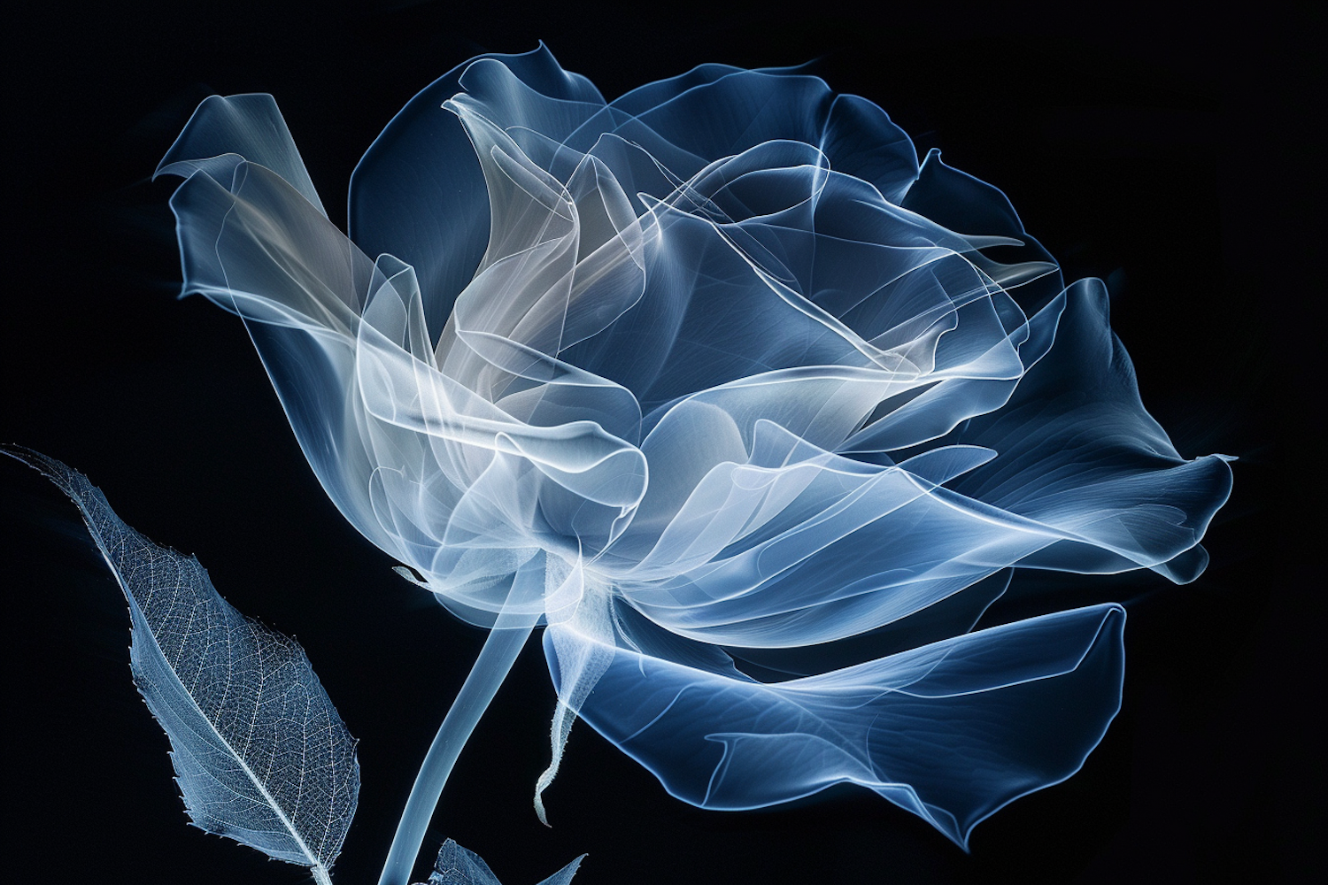Ethereal x-ray style rose with glowing petals against a dark background, showcasing delicate details and graceful lines.