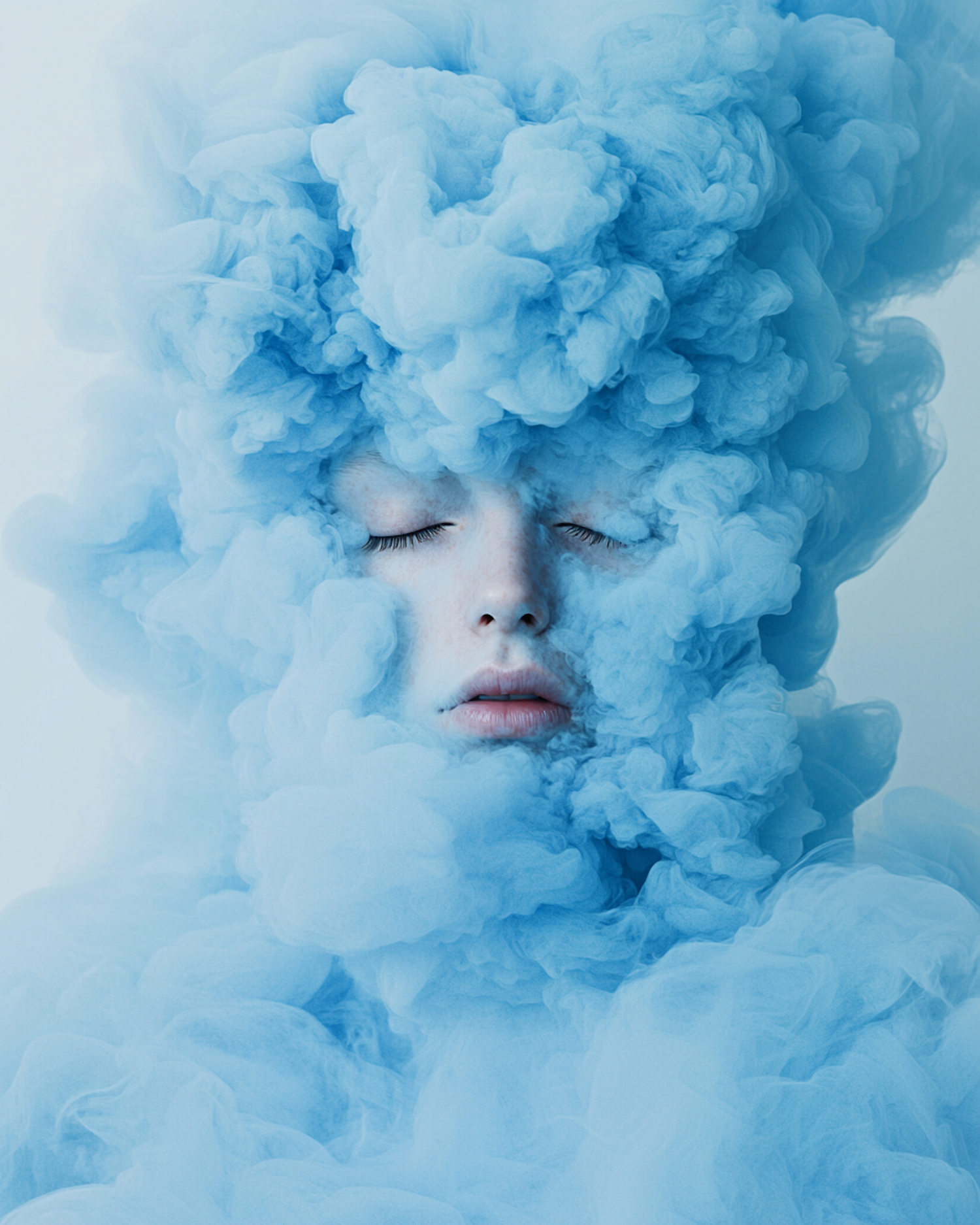A serene face surrounded by swirling blue smoke, creating a dreamy and ethereal visual effect with soft textures and calming tones.