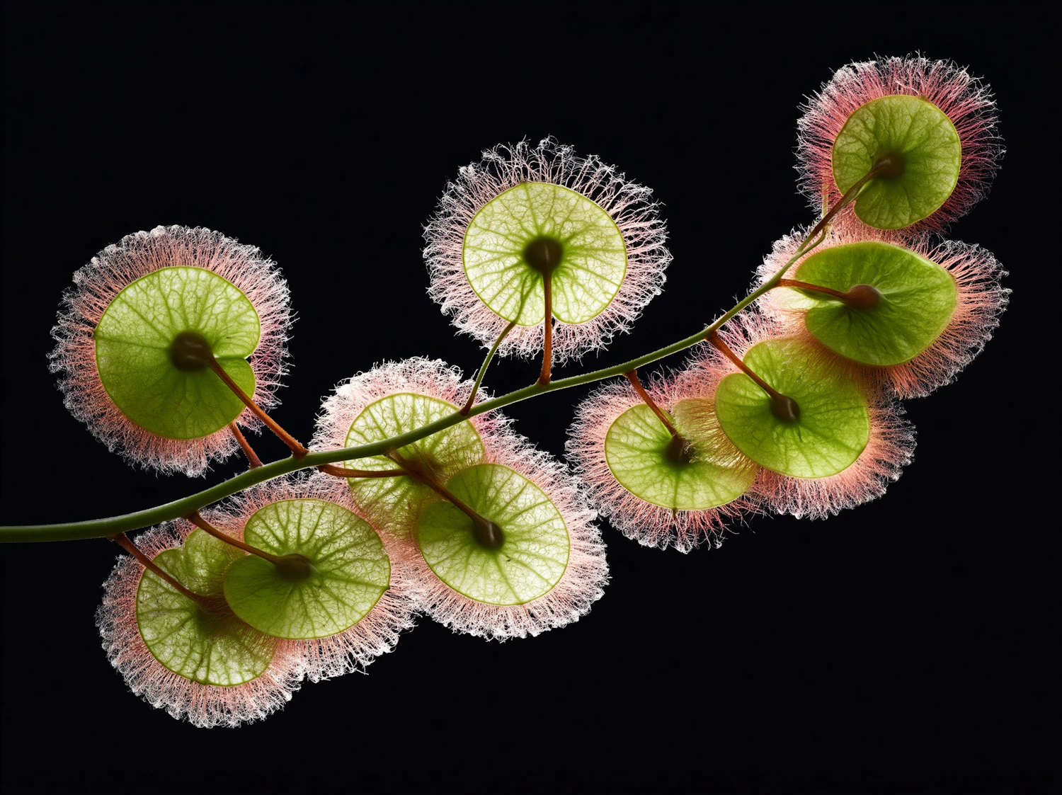 Close-up of green leaves with pink, hair-like structures on a black background, highlighting intricate botanical details.