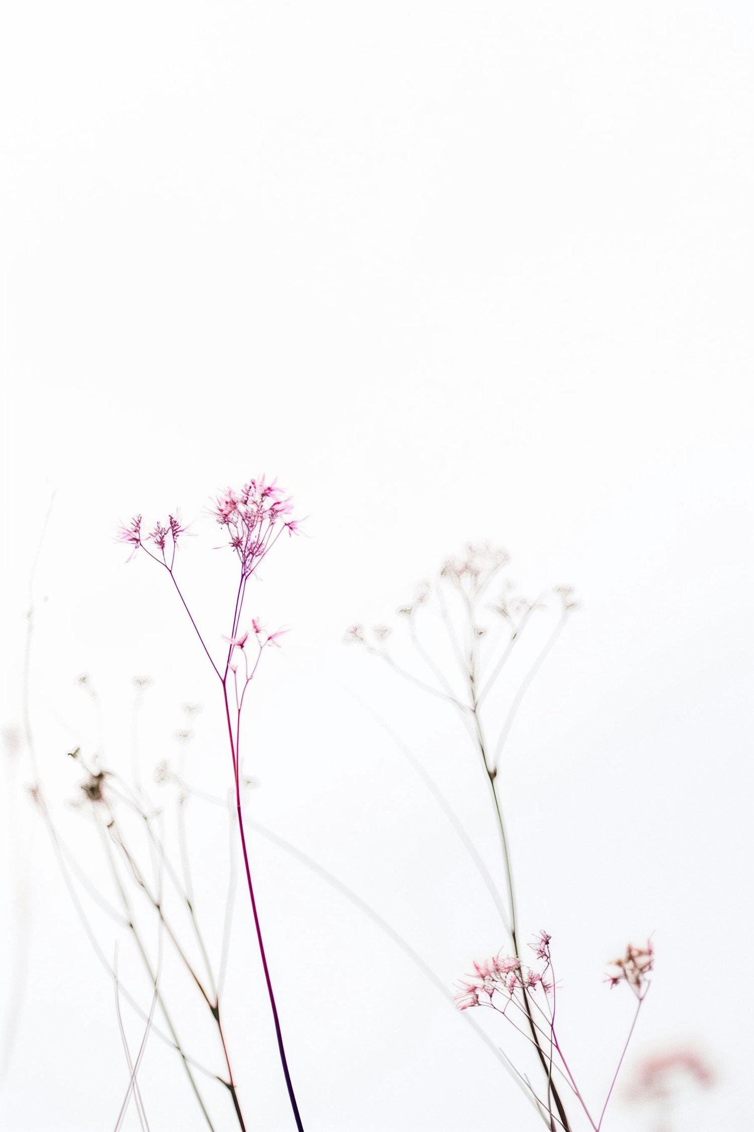 Minimalist image of delicate pink wildflowers against a white background, highlighting their elegance and simplicity.