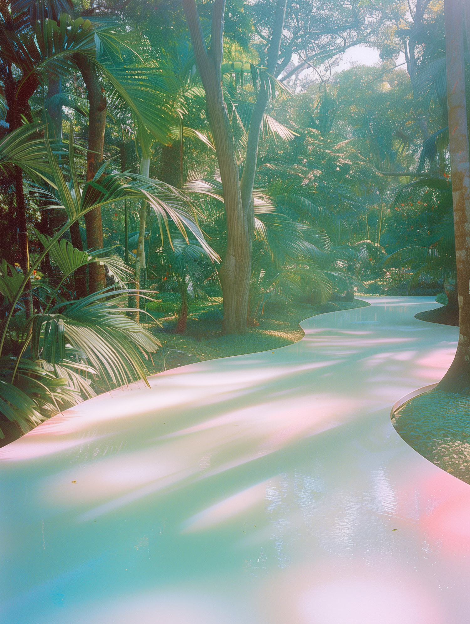 Dreamlike jungle scene with lush greenery, dappled sunlight, and a glossy, pastel-hued path winding through the forest.