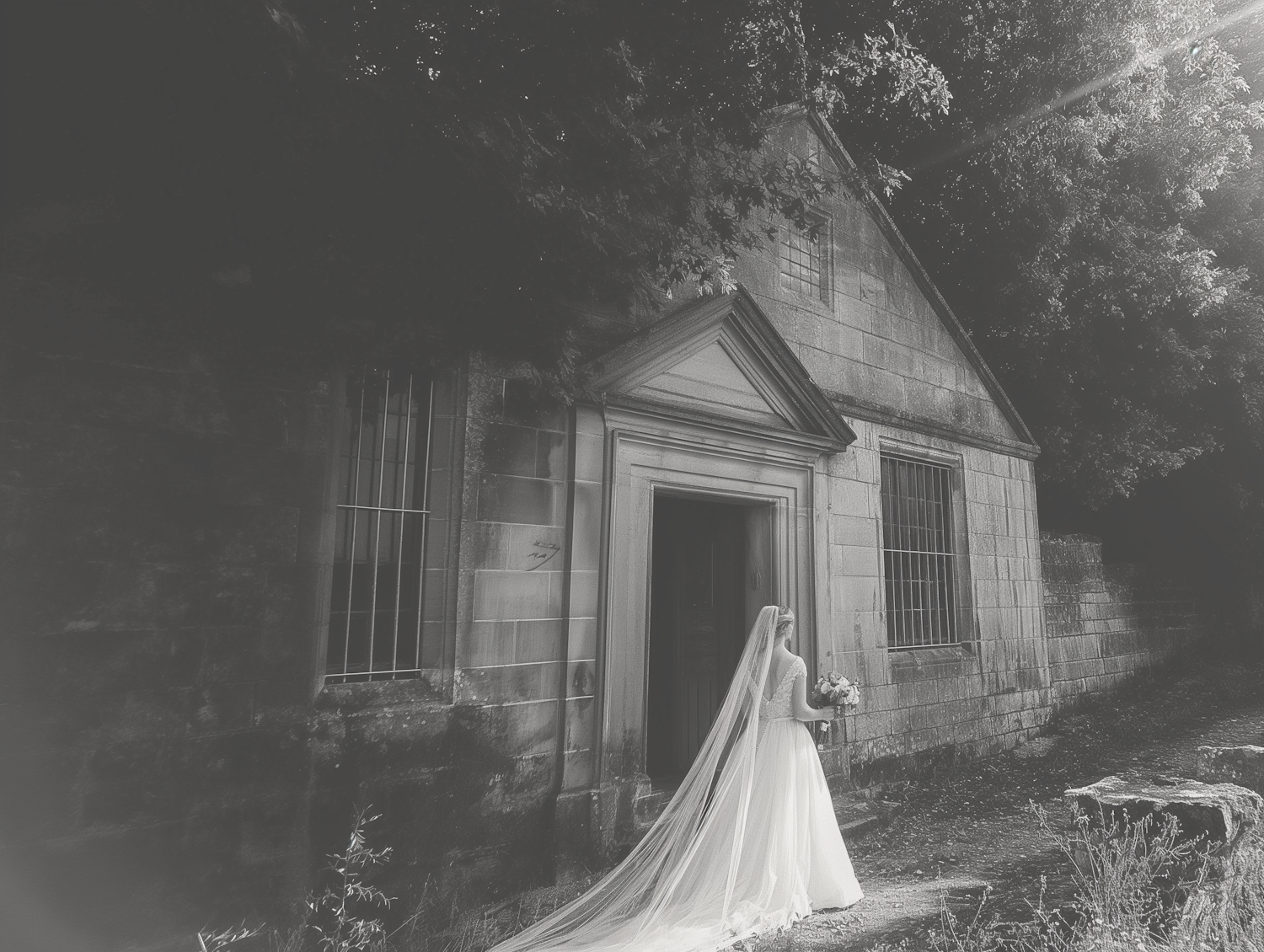 A bride in a long veil stands before an old stone building, bathed in dappled sunlight, creating a timeless and ethereal scene.