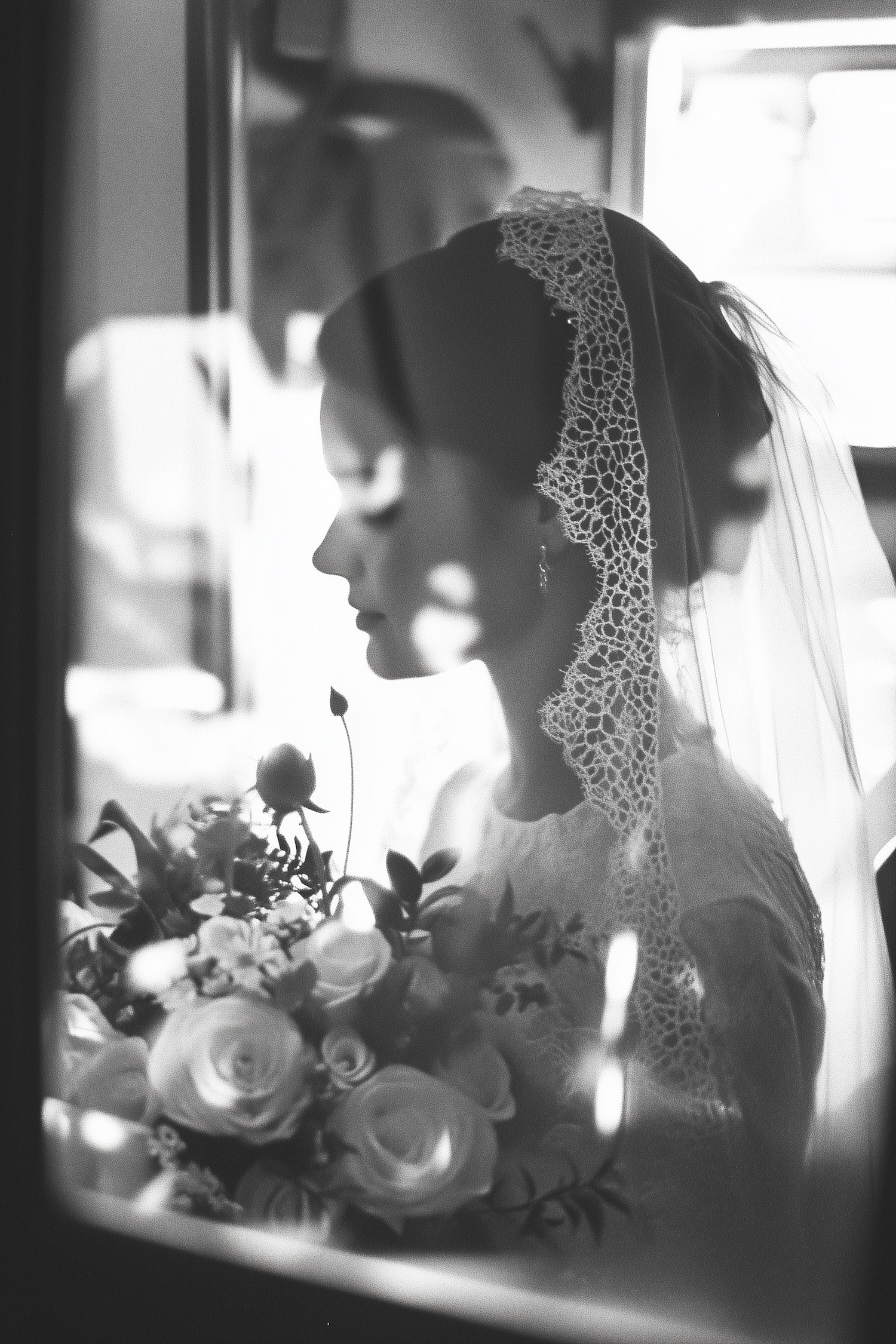 Elegant black and white bridal portrait with lace veil and floral bouquet, capturing a serene and timeless moment.