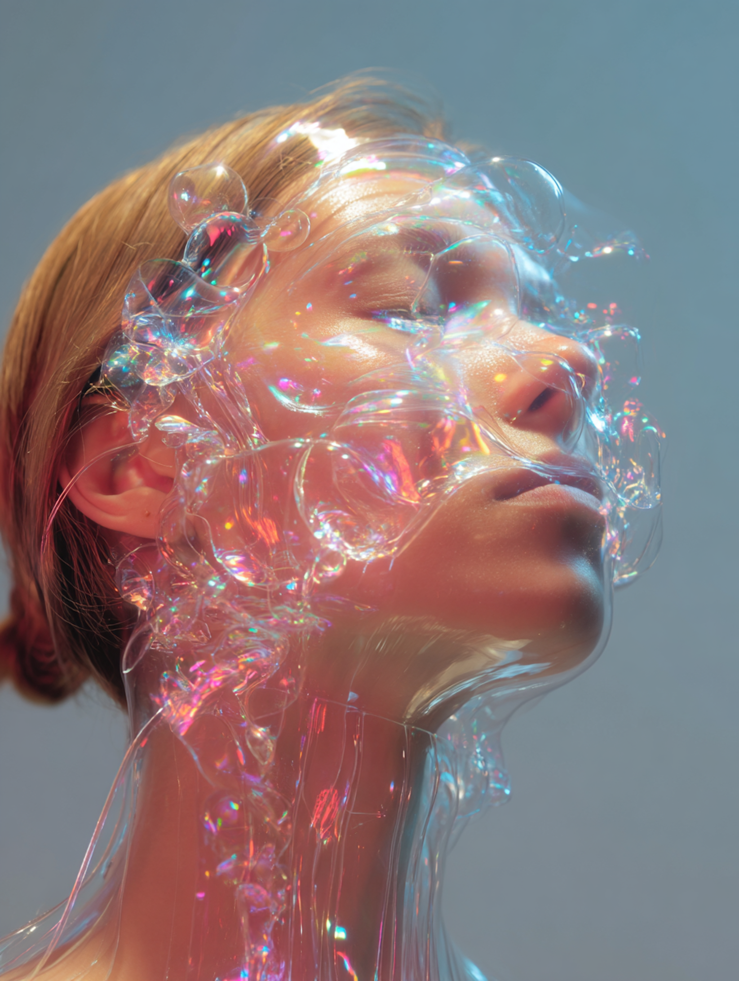 A serene portrait of a person with iridescent bubbles on their face, reflecting vibrant colors against a soft gradient background.