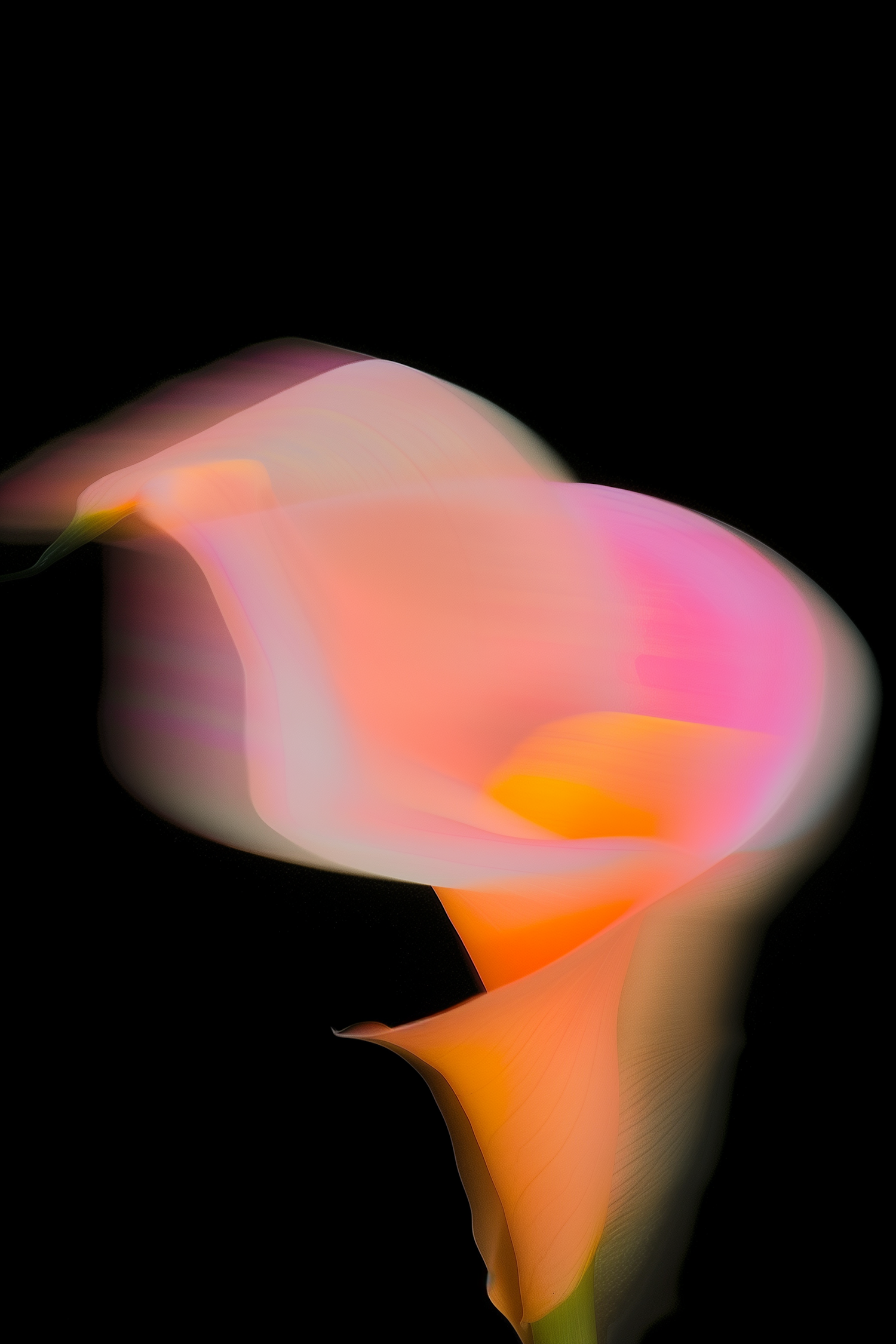 A dreamy, abstract close-up of a glowing calla lily with soft orange, pink, and yellow hues against a black background.