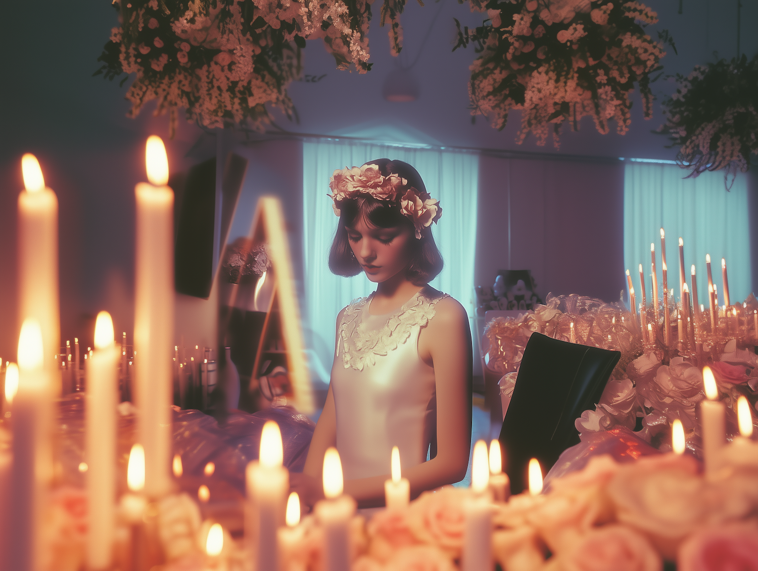 A serene woman in a floral crown amidst glowing candles and flowers, creating a tranquil and romantic atmosphere.