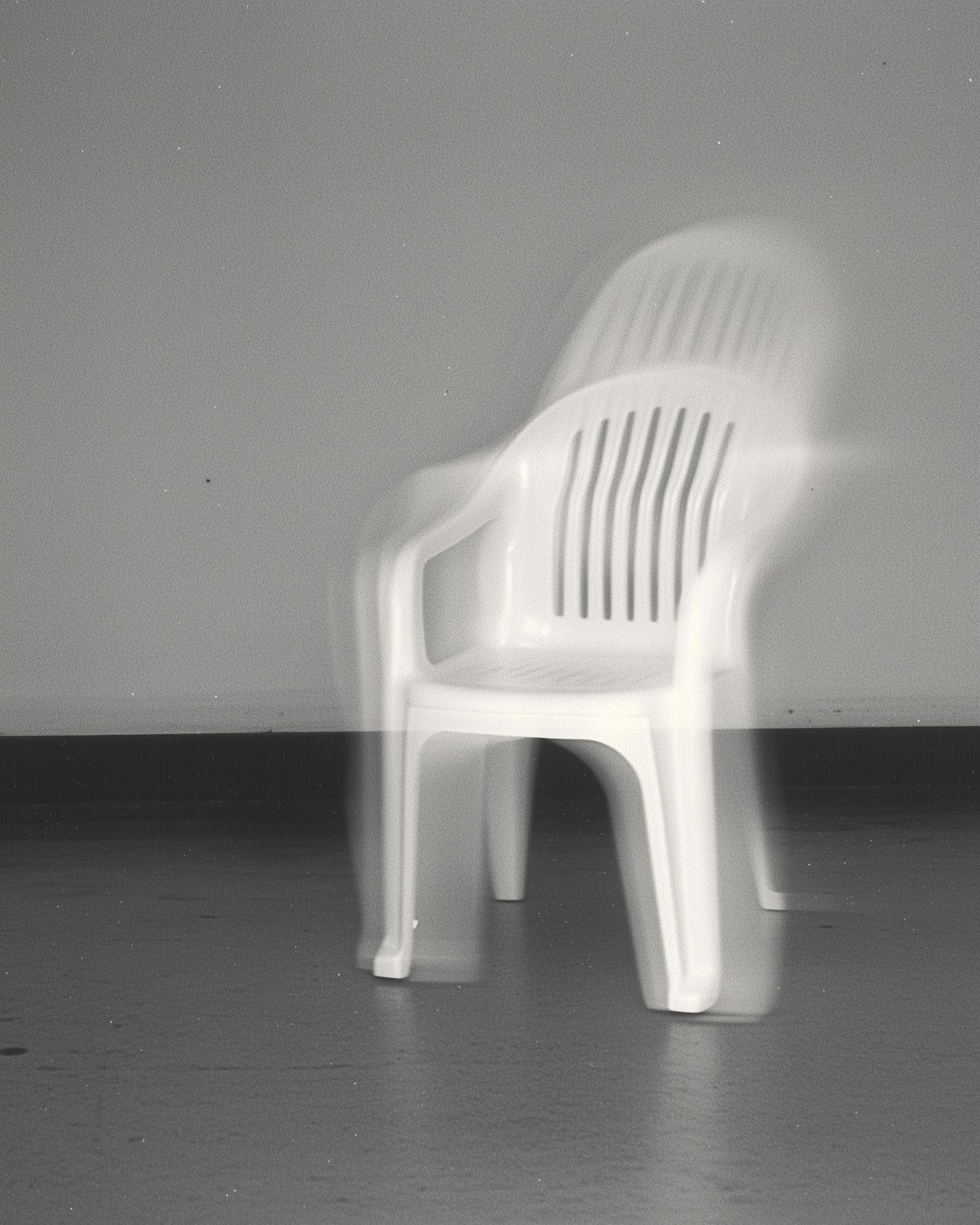 A white plastic chair appears to vibrate or shift due to a long exposure effect, creating a ghostly, surreal look against a plain background.