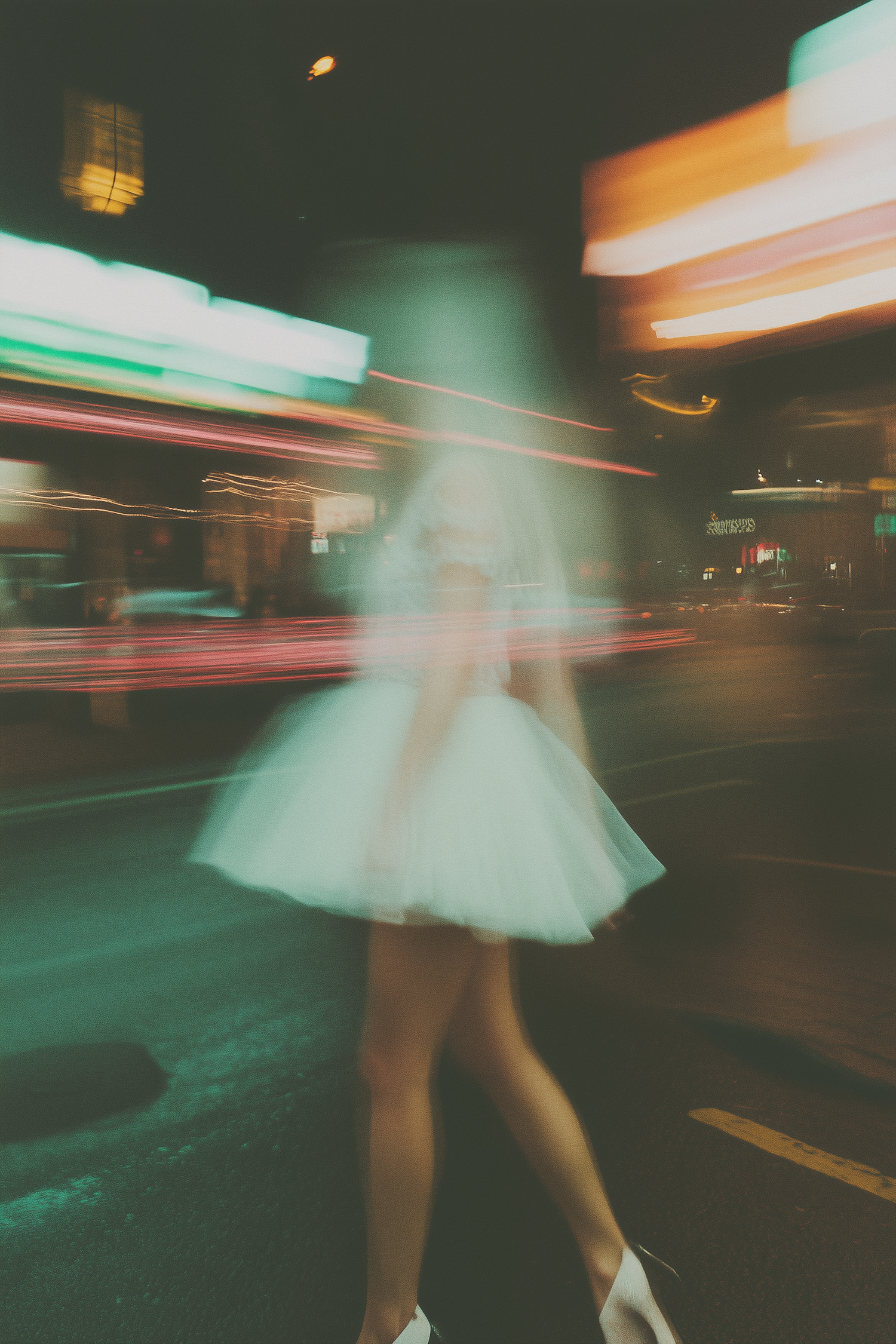 Blurred figure in a white dress on a neon-lit city street at night, creating a dreamy, surreal urban vibe with vibrant light streaks.