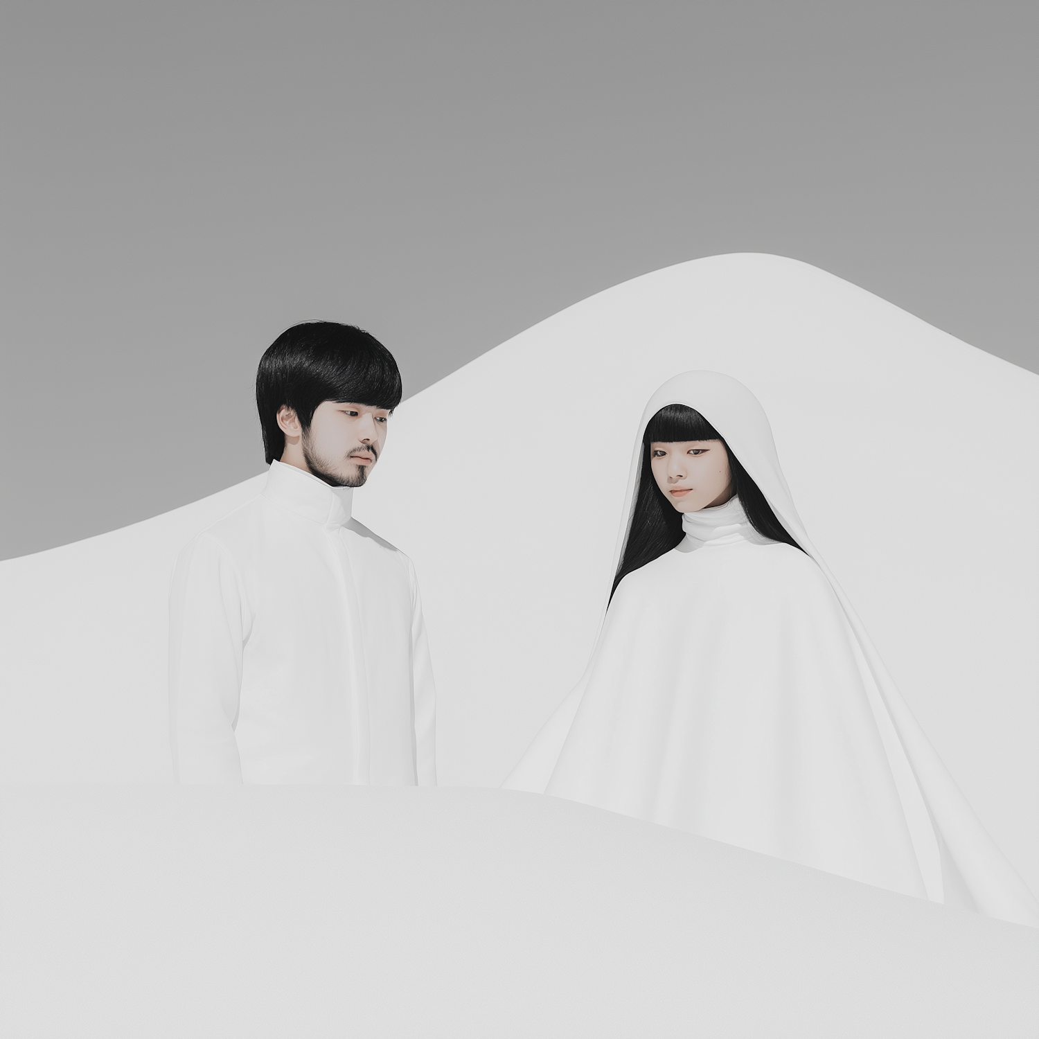 Minimalist scene with two individuals in white attire against a soft, gradient background, evoking a serene and futuristic atmosphere.