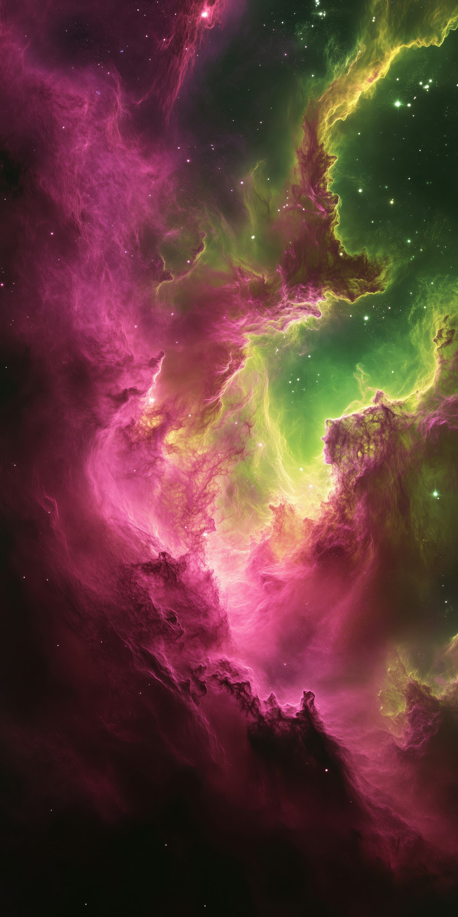 Explore a stunning cosmic scene with vibrant pink and green nebulae, swirling gas clouds, and twinkling stars in deep space.