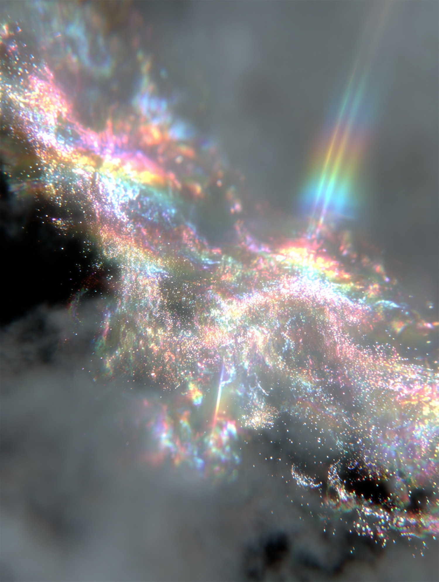 A stunning display of iridescent light and sparkling particles, resembling a cosmic nebula with vibrant colors and a dreamy atmosphere.