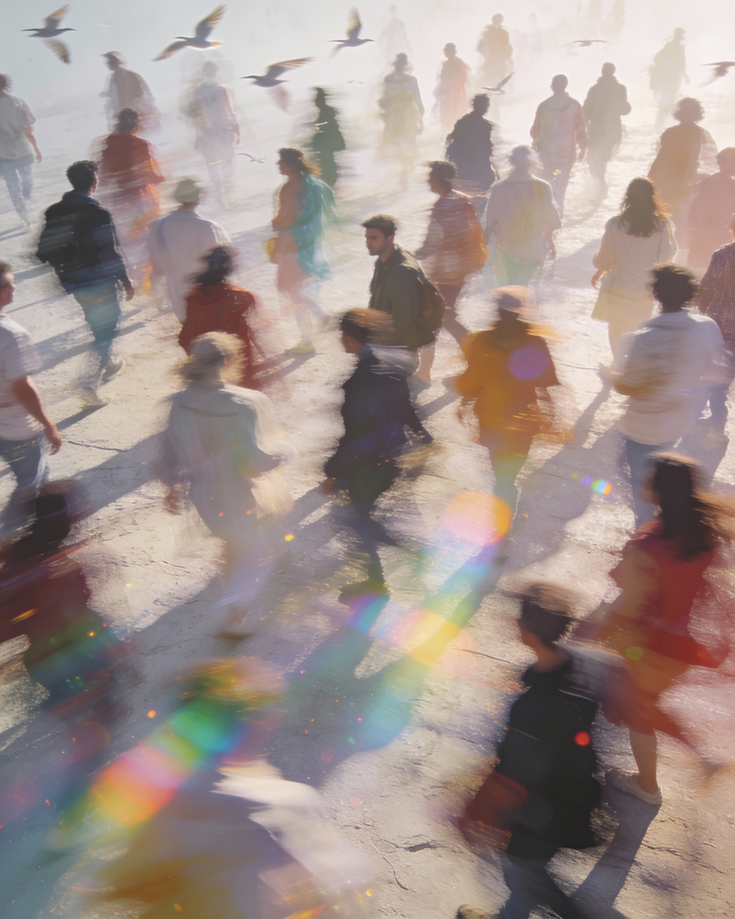 Bird’s eye view of a moving crowd, faces indistinct, bodies forming blurred color shapes, rainbow light artifacts, airy daylight tones, wide lens depth, poetic and contemplative mood