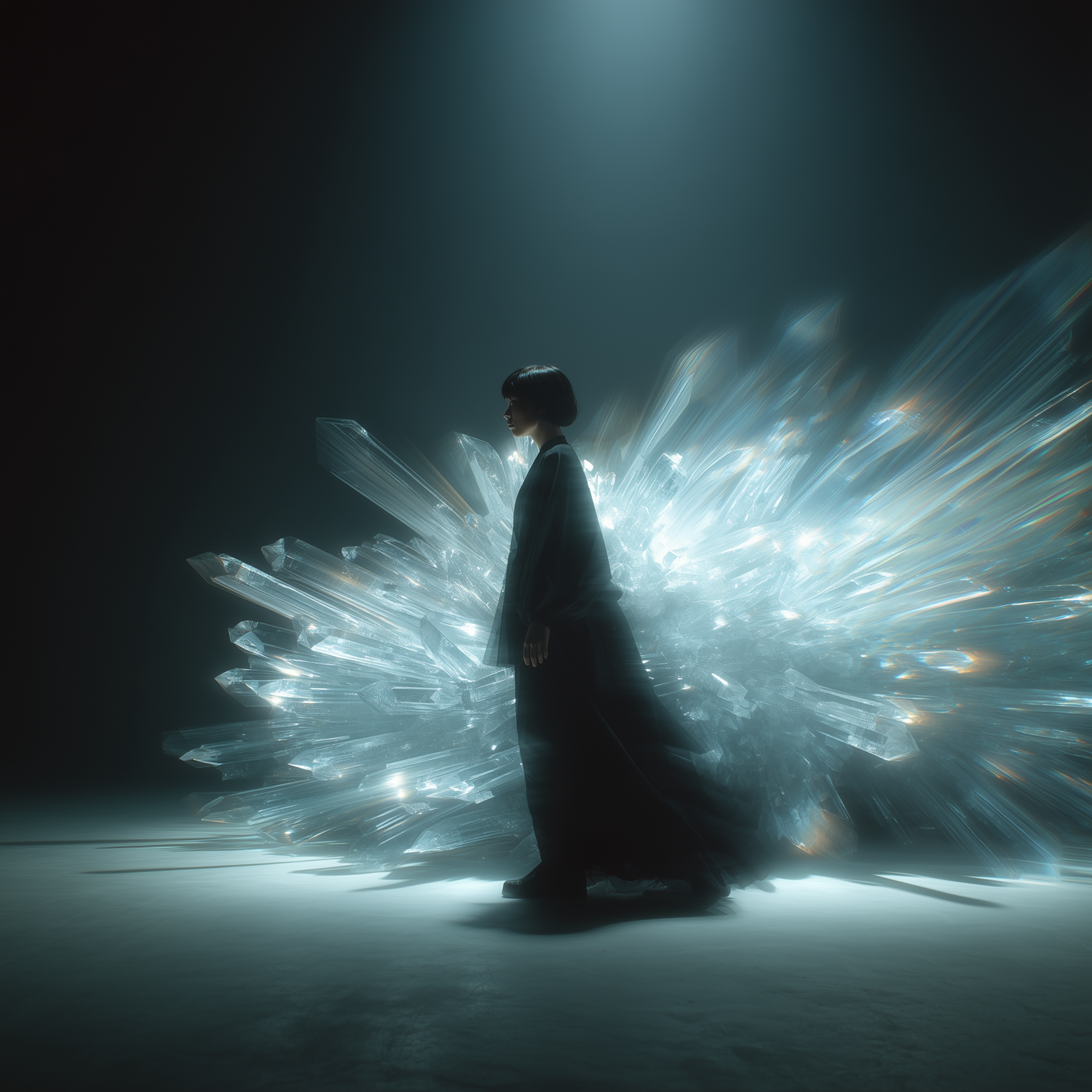 A person in dark attire stands before a glowing cluster of crystals, creating a mystical and dramatic visual in a dimly lit space.