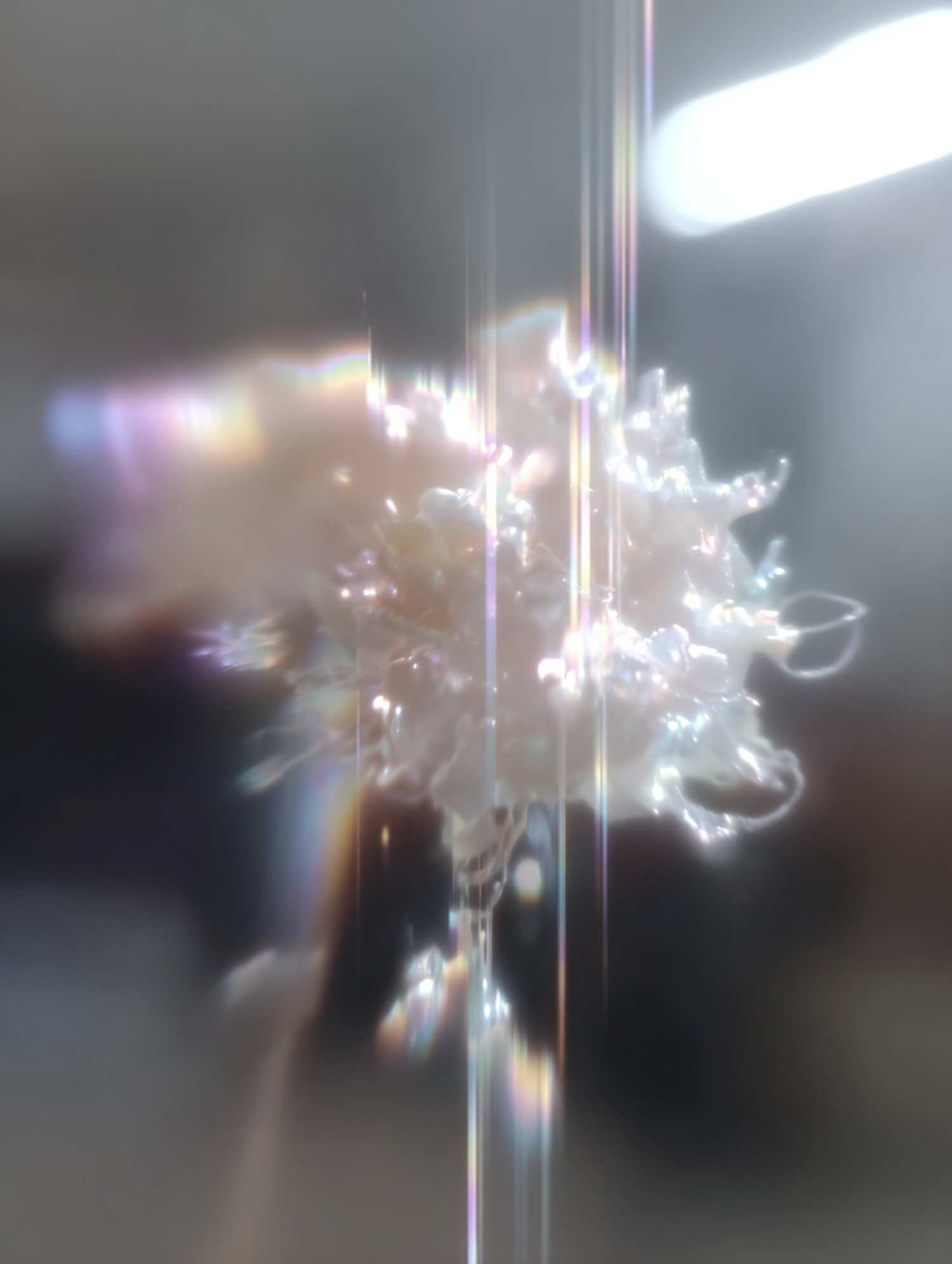 A close-up of a translucent, crystalline structure with refracted light creating a dreamy, ethereal effect against a blurred background.