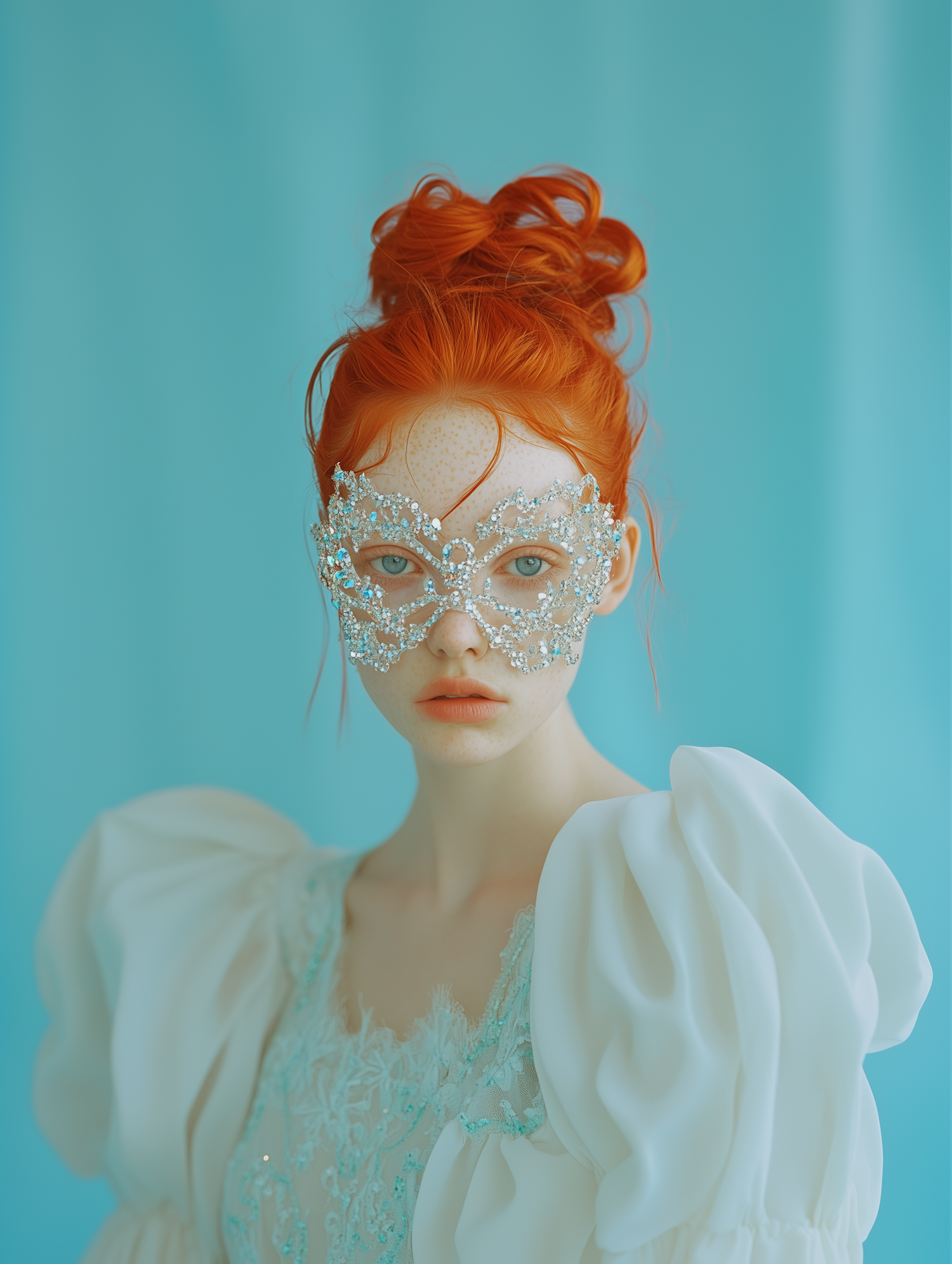 Ethereal portrait of a red-haired woman in a crystal mask and puffed-sleeve dress, set against a soft turquoise background.