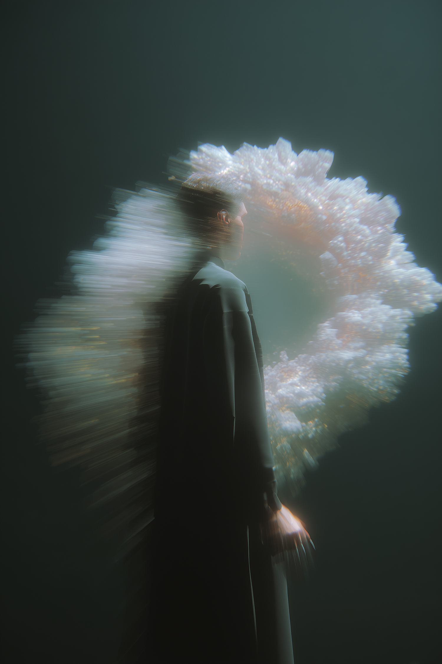 A surreal scene of a person with a glowing, crystalline halo-like structure in a dark, ethereal setting.