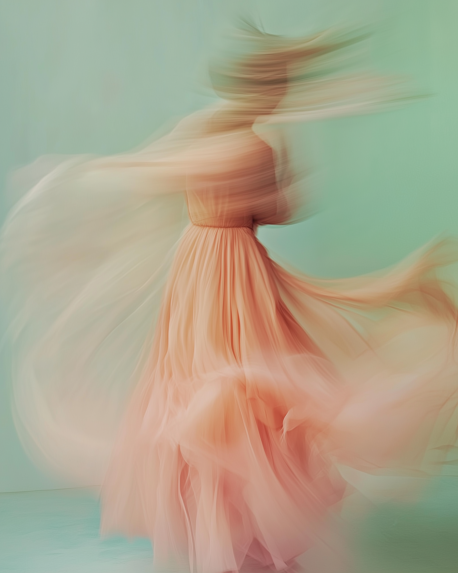 Ethereal motion blur of a person spinning in a flowing peach dress against a soft green background, creating a dreamlike effect.