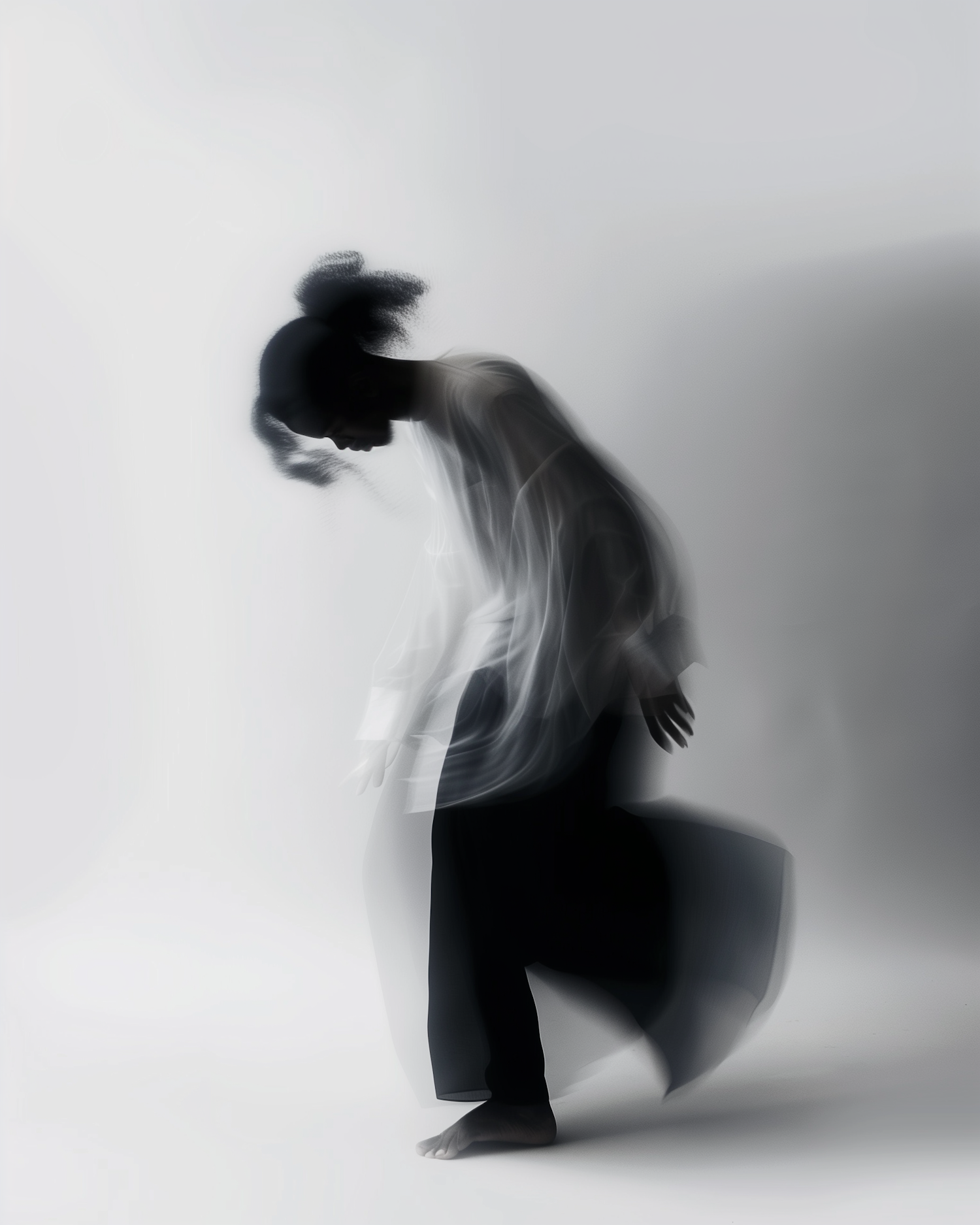 Ethereal blurred photo of a person in motion, wearing a flowing white top and dark pants, set against a soft gray background.