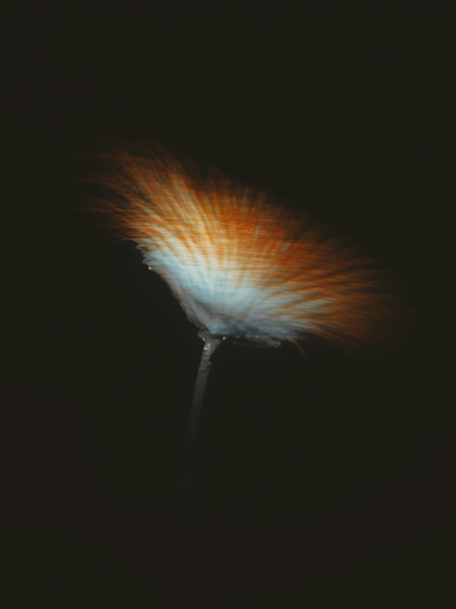 A vibrant close-up of a dandelion-like structure with orange and blue hues against a dark background, creating a striking visual contrast.