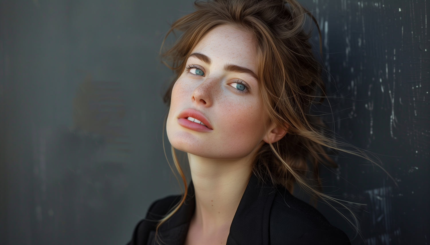 Portrait of a young woman with blue eyes and light brown hair against a gray background, wearing a black jacket.