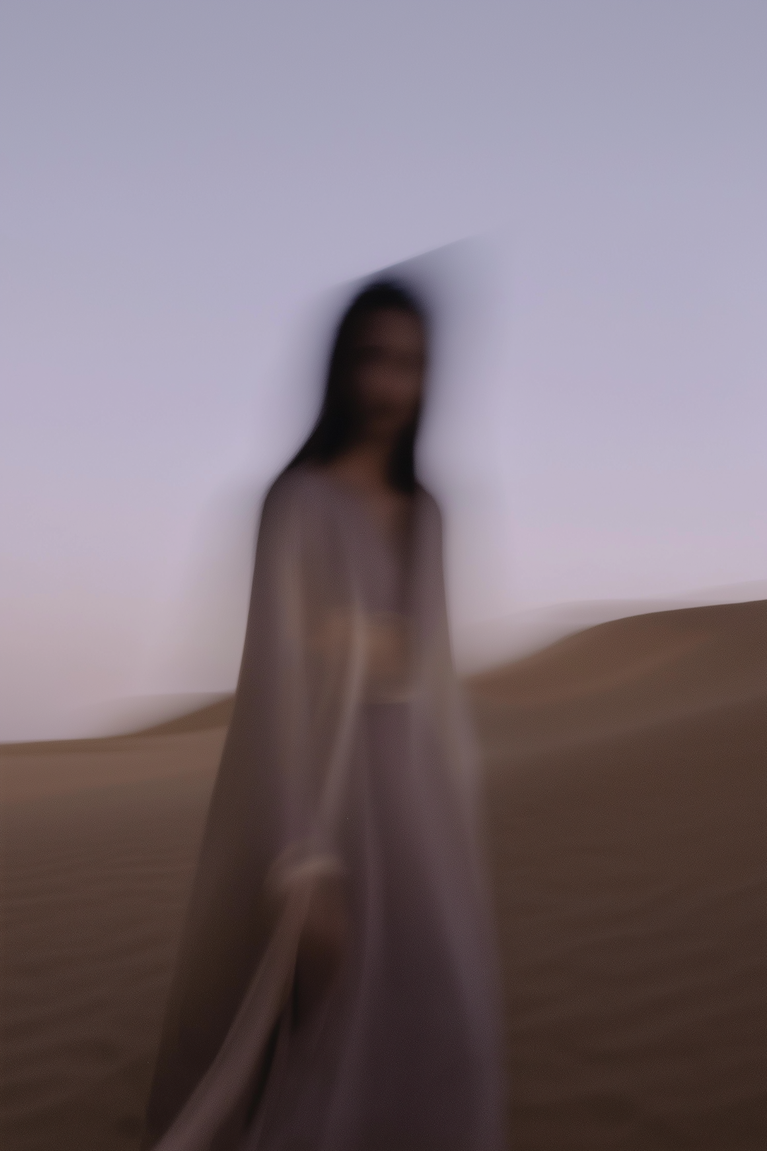 Blurred figure in a desert landscape, creating a mysterious and ethereal atmosphere with soft, muted colors and flowing garments.