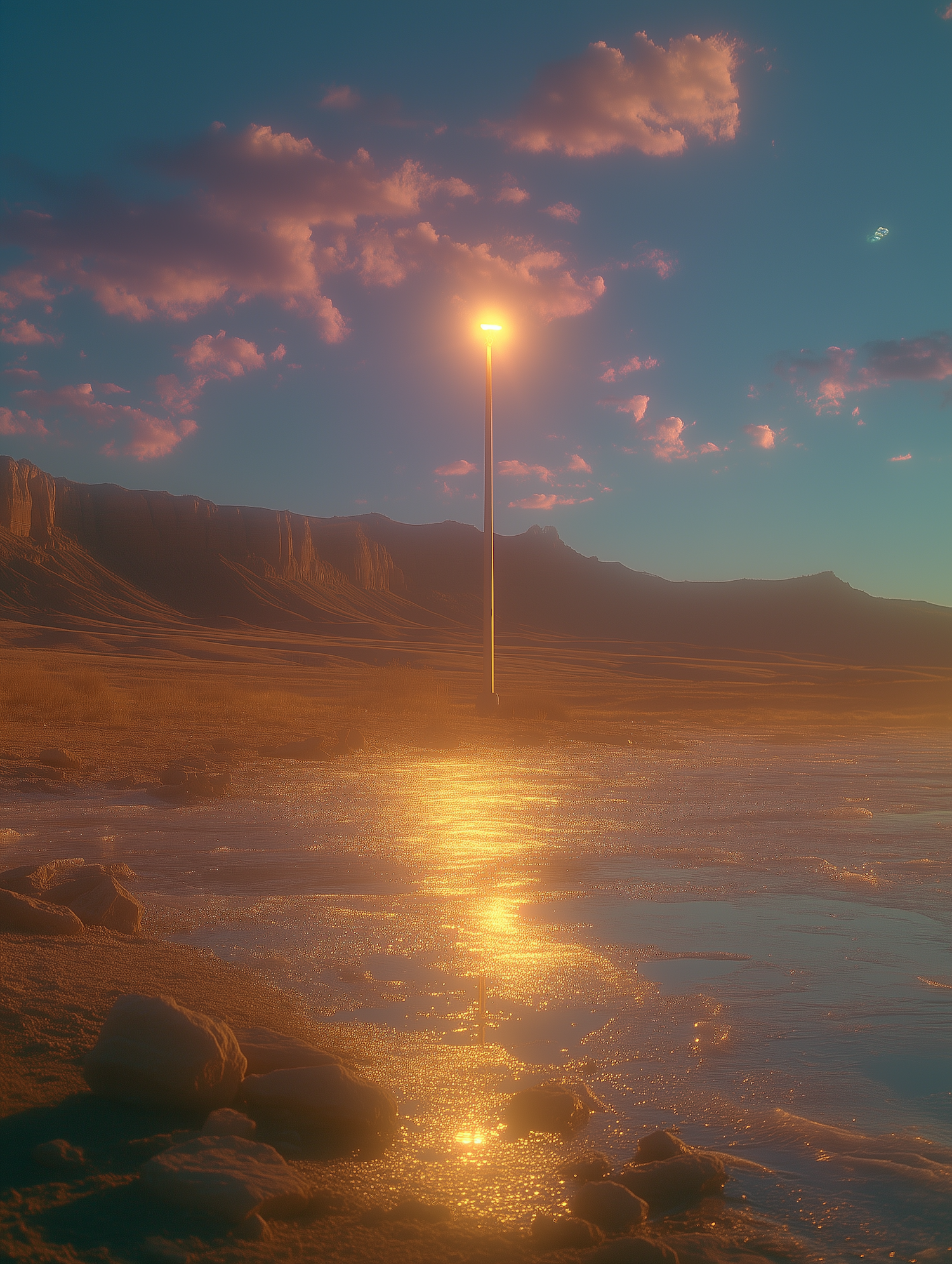 A glowing light source in a desert landscape reflects on water, surrounded by cliffs and a colorful sky, creating a surreal scene.