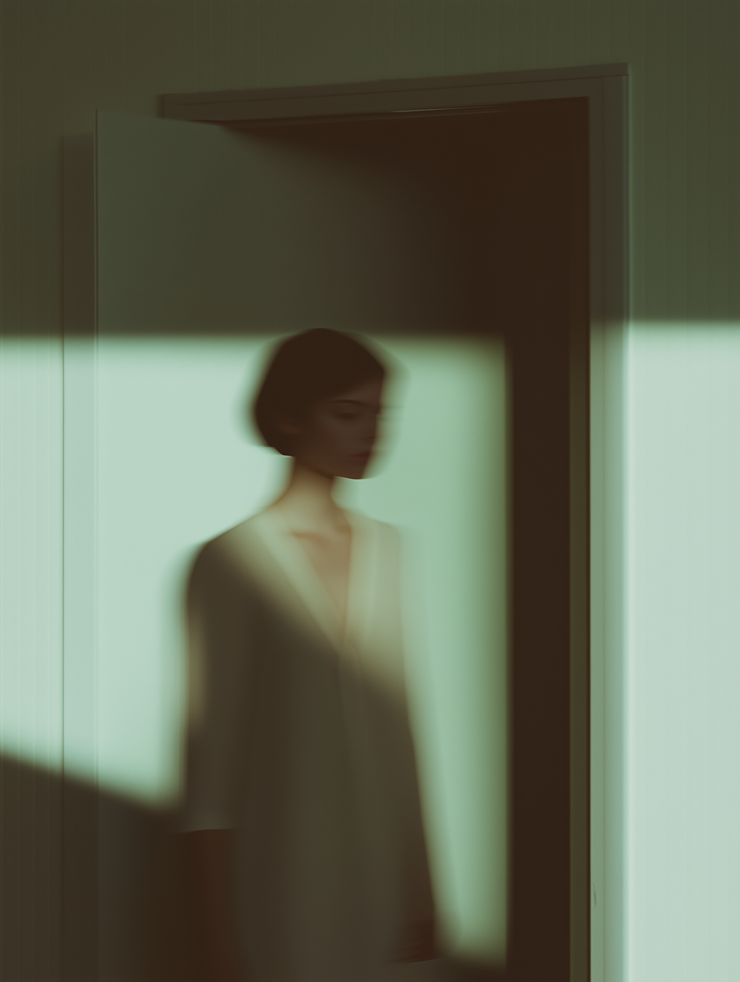 Blurred figure in a doorway with ethereal lighting and muted green tones, creating a mysterious and dreamlike atmosphere.