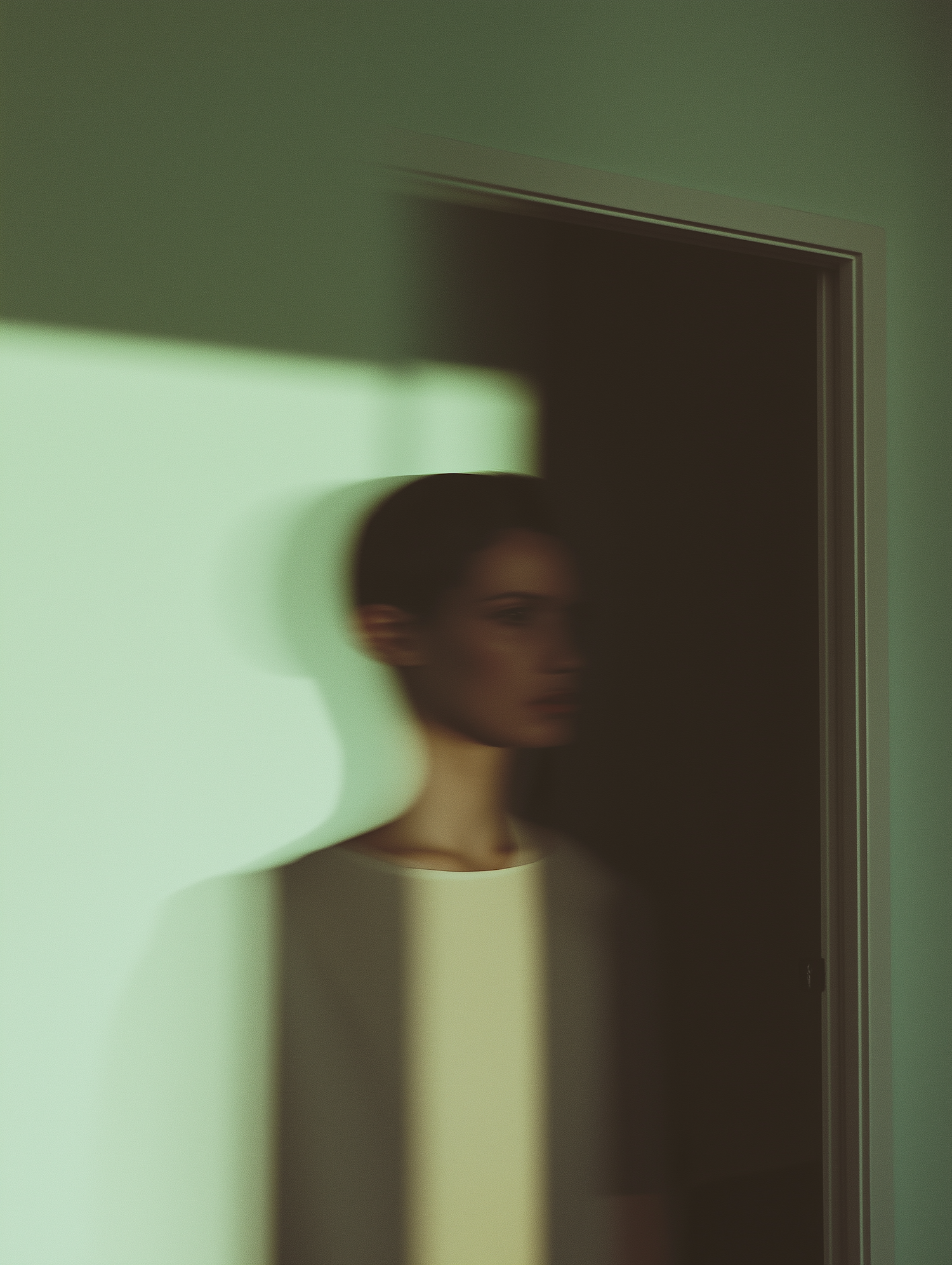 Blurred figure in a doorway casting shadows on a pale green wall, creating a mysterious and ethereal atmosphere.