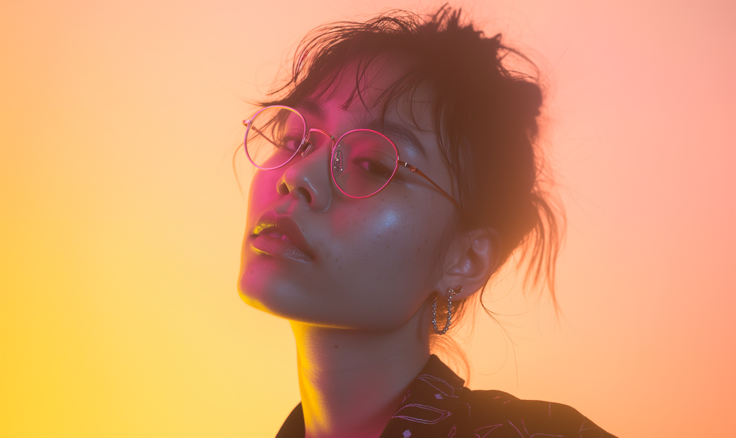 Close-up portrait of an Asian woman with glasses, warm pink and orange lighting, and a confident expression.