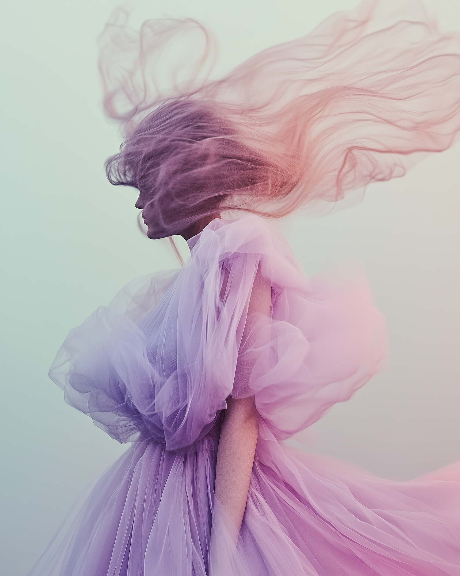 Ethereal woman in flowing pink and purple dress with hair swept back, set against a pastel gradient background.