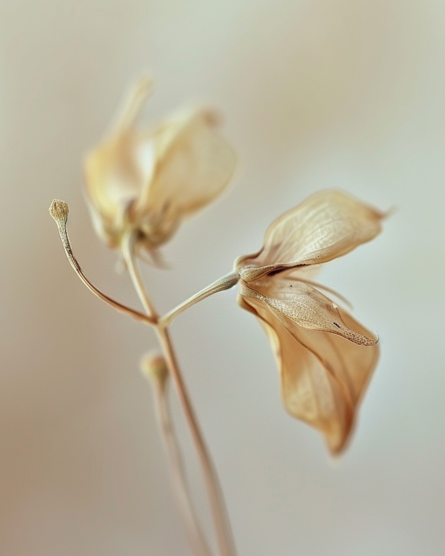 Close-up of a delicate dried plant with translucent beige petals and slender stems against a soft, blurred background.