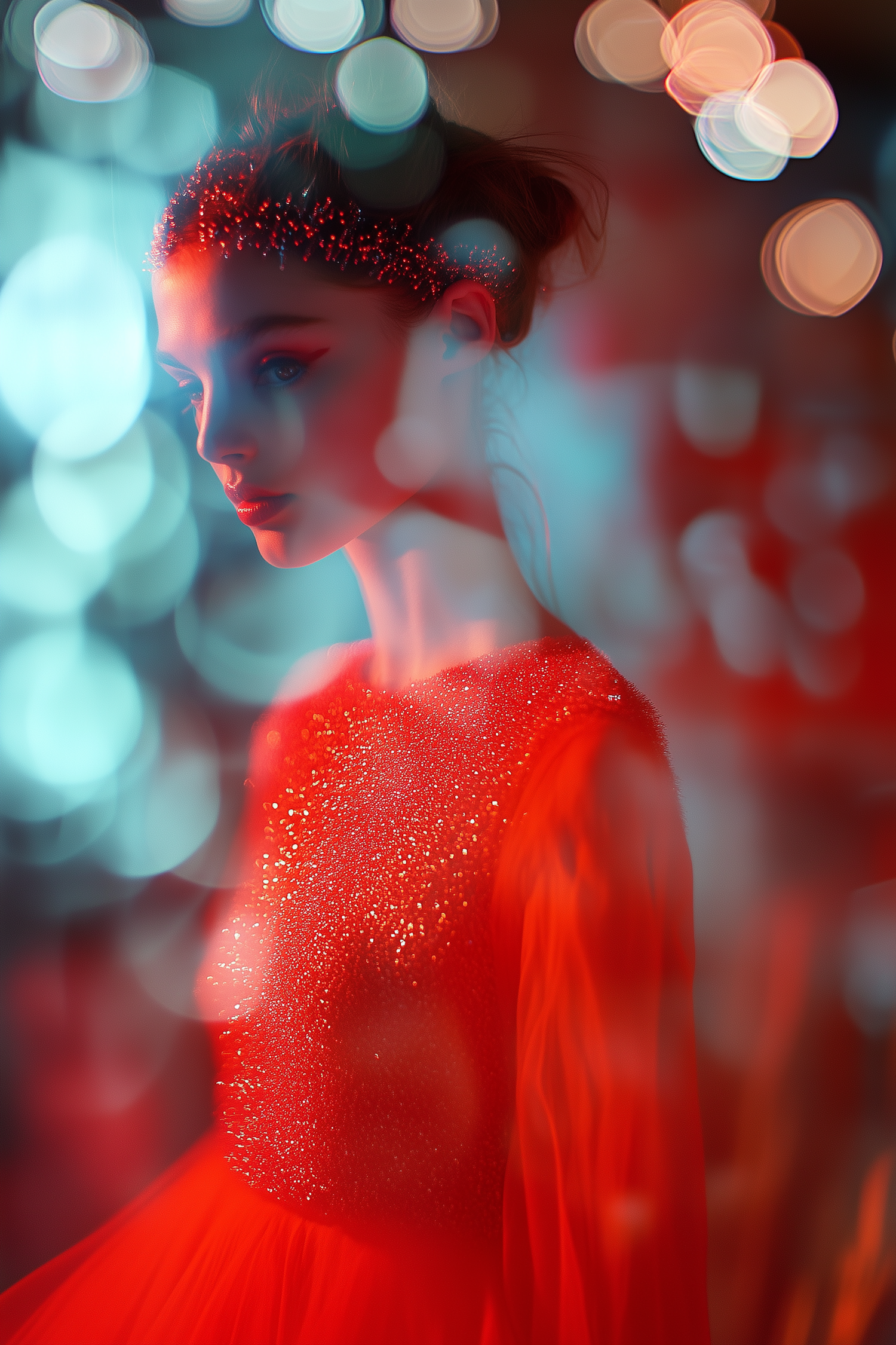 Ethereal portrait of a woman in a red dress with sparkling headband, surrounded by dreamy bokeh lights in blue and red hues.