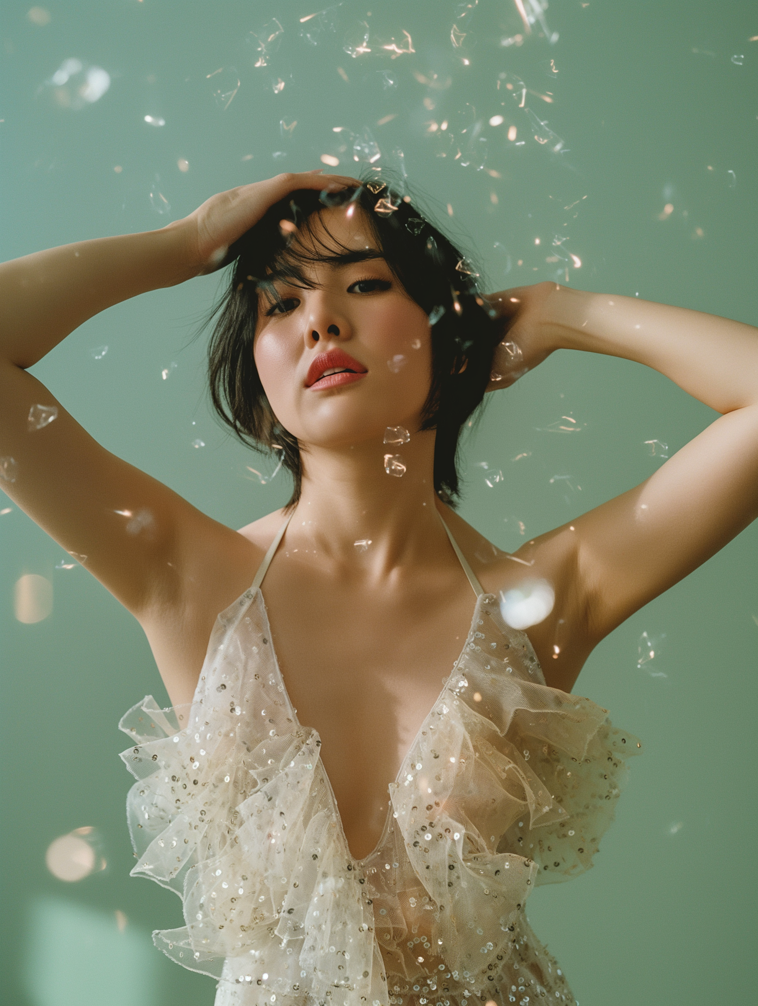 Asian woman in a sheer, sequined dress poses gracefully with sparkling particles in a dreamy, ethereal setting.