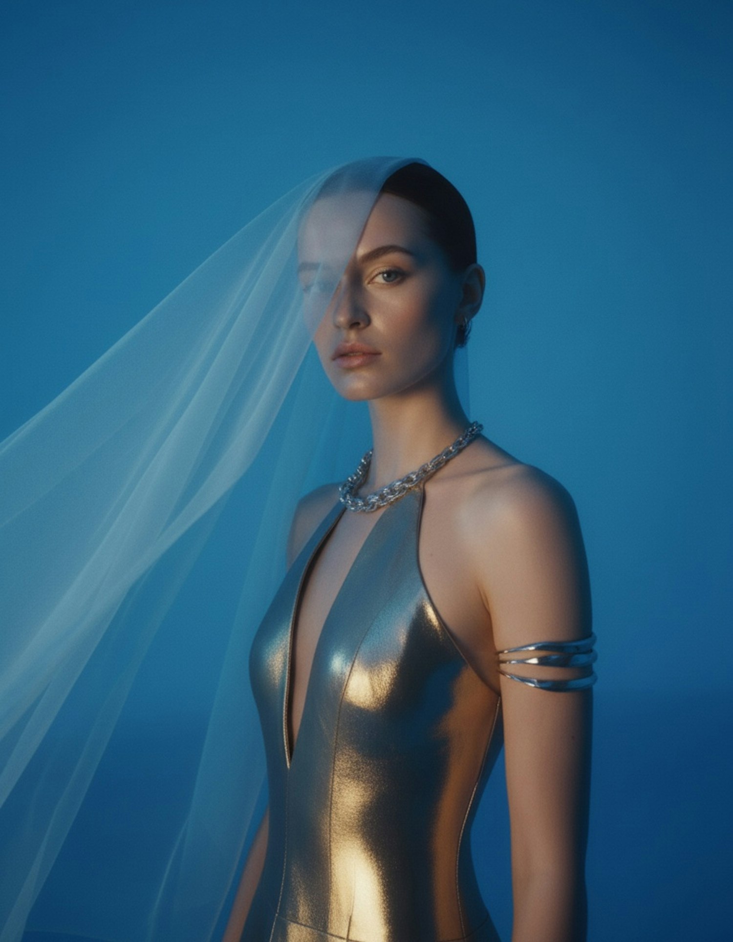 A woman in a metallic gold dress with a sheer veil and silver accessories, set against a blue background with soft lighting.
