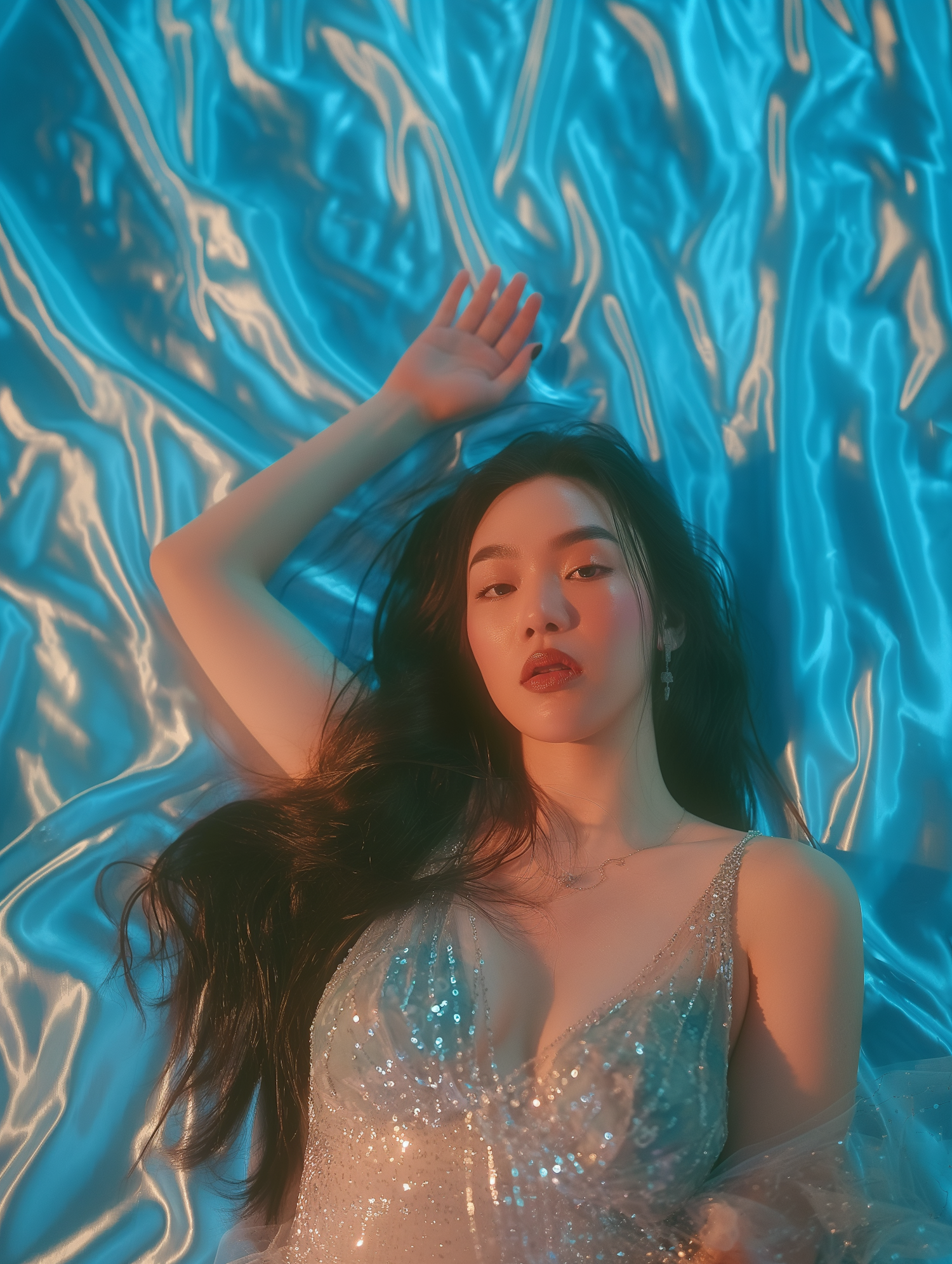 A serene woman in a sparkling dress lies on iridescent blue fabric, creating a dreamy, ethereal atmosphere with reflective lighting.
