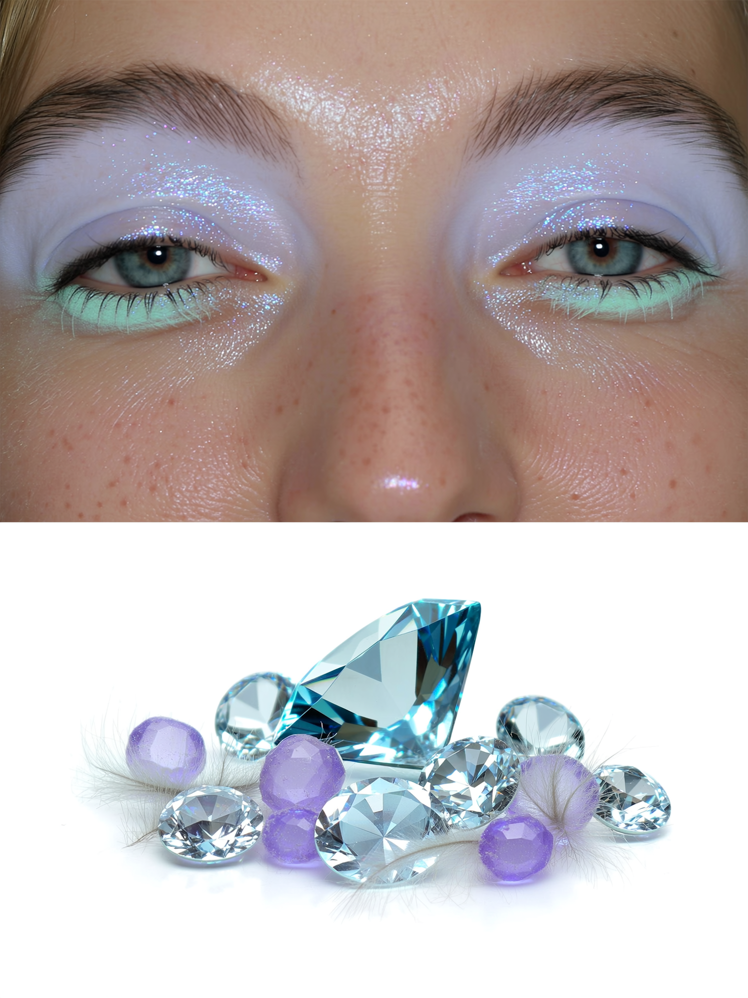 Close-up of shimmering pastel eye makeup paired with a display of sparkling blue and purple gemstones on a white background.